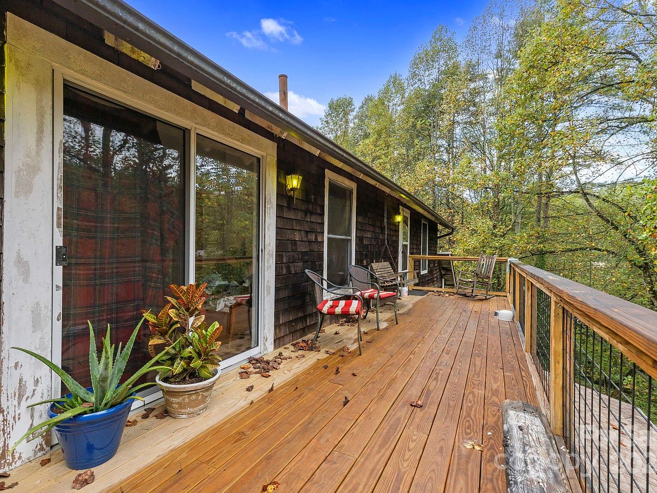 A spacious wooden deck extends alongside the house, bordered with a sturdy railing featuring metal balusters and a wide, flat handrail. The siding consists of deep brown wood shingles, accented by large sliding glass doors with white trim, partially worn and rustic in appearance. Two potted plants, including an aloe and a croton, add a pop of green near the entry. Simple black-framed chairs with red and white striped cushions and a classic wooden rocking chair create a laid-back atmosphere. The deck overlooks dense, leafy trees and the surrounding natural landscape, creating a serene, forested backdrop.