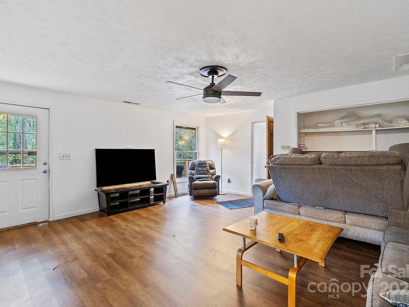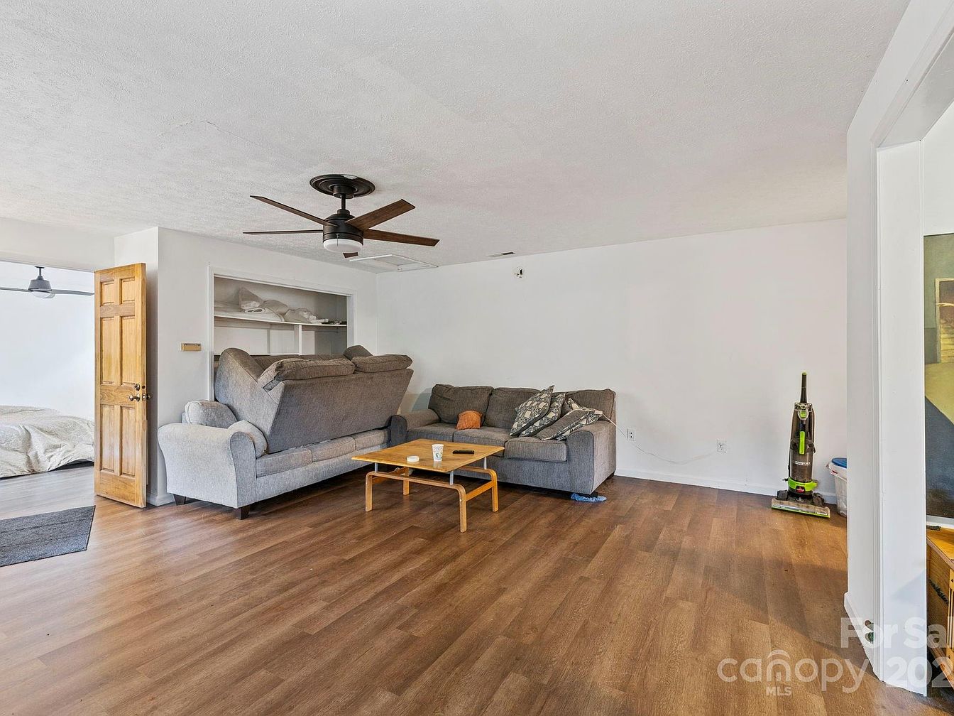 A spacious living room featuring light wood flooring and white walls, creating a bright and airy atmosphere. A dark gray sectional sofa faces a flat-screen television on a simple black media console. The room has a ceiling fan with a sleek black design, adding a modern touch. At the front, a light wood coffee table sits in front of the sofa. To the right, there’s an open closet with shelves holding linens. Two large windows allow natural light in, complemented by a floor lamp beside a brown recliner. Minimalist decor emphasizes an uncluttered and comfortable space suitable for relaxation.