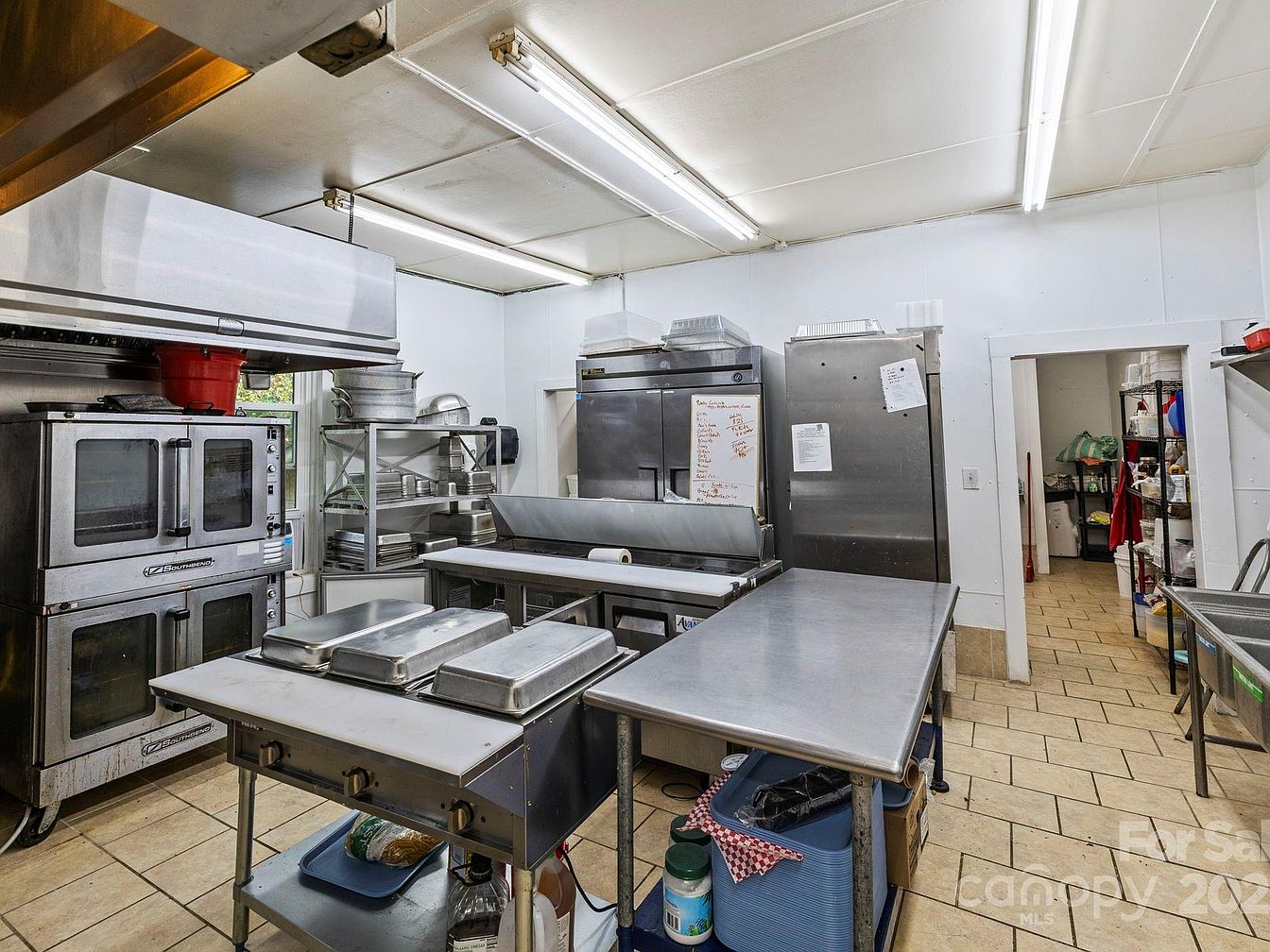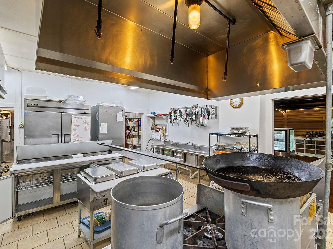 This spacious kitchen area is optimized for professional cooking, featuring large stainless-steel appliances and industrial cooking equipment. Overhead, a large metal ventilation hood houses industrial light fixtures, providing both illumination and airflow above the stovetop and preparation areas. The countertops and workstations are metallic, offering durability and easy cleaning, while several large refrigerators and storage units dominate the far wall. A pegboard holds a wide array of hanging utensils, all easily accessible for chefs. The tile flooring is arranged in a simple rectangular pattern, complementing the predominantly silver and white color scheme that highlights functionality over decoration.