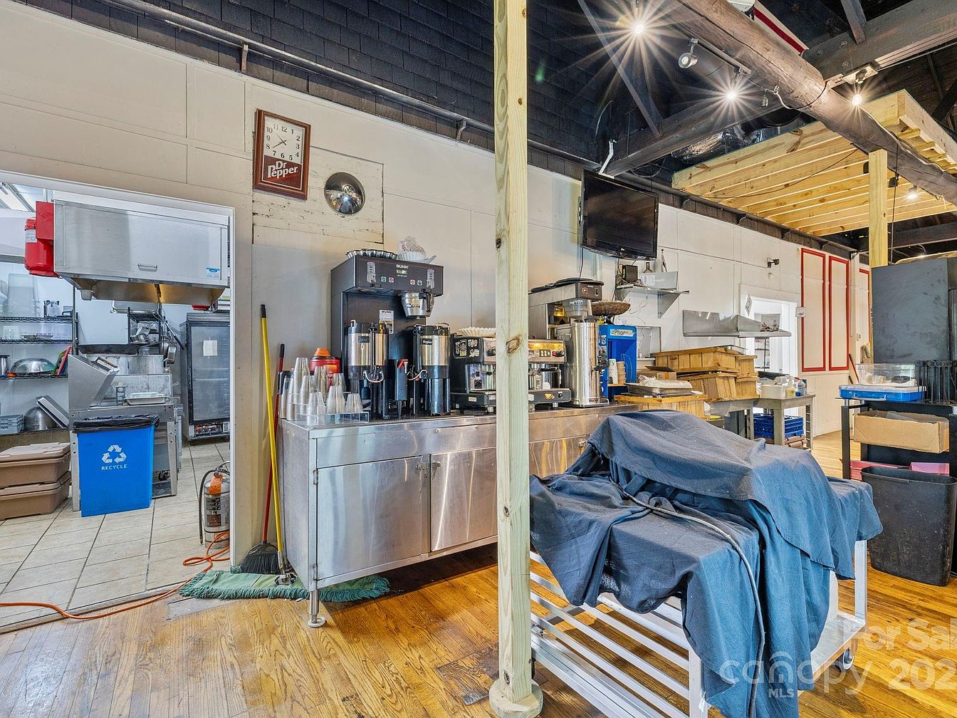A large kitchen area featuring a beverage station with several commercial coffee makers, a grinder, and stacks of clear plastic cups on a metal countertop. The floor is a mix of light wood planks and beige tiles, with cleaning tools like a mop and broom leaning against the wall. Overhead are exposed black beams with industrial lighting and a partially constructed wooden loft area. Walls are painted white with a retro Dr. Pepper clock, metallic backsplash, and a wall-mounted television. Open shelving and stainless appliances hint at a professional or semi-commercial set-up, while recycling bins and storage boxes indicate active use.