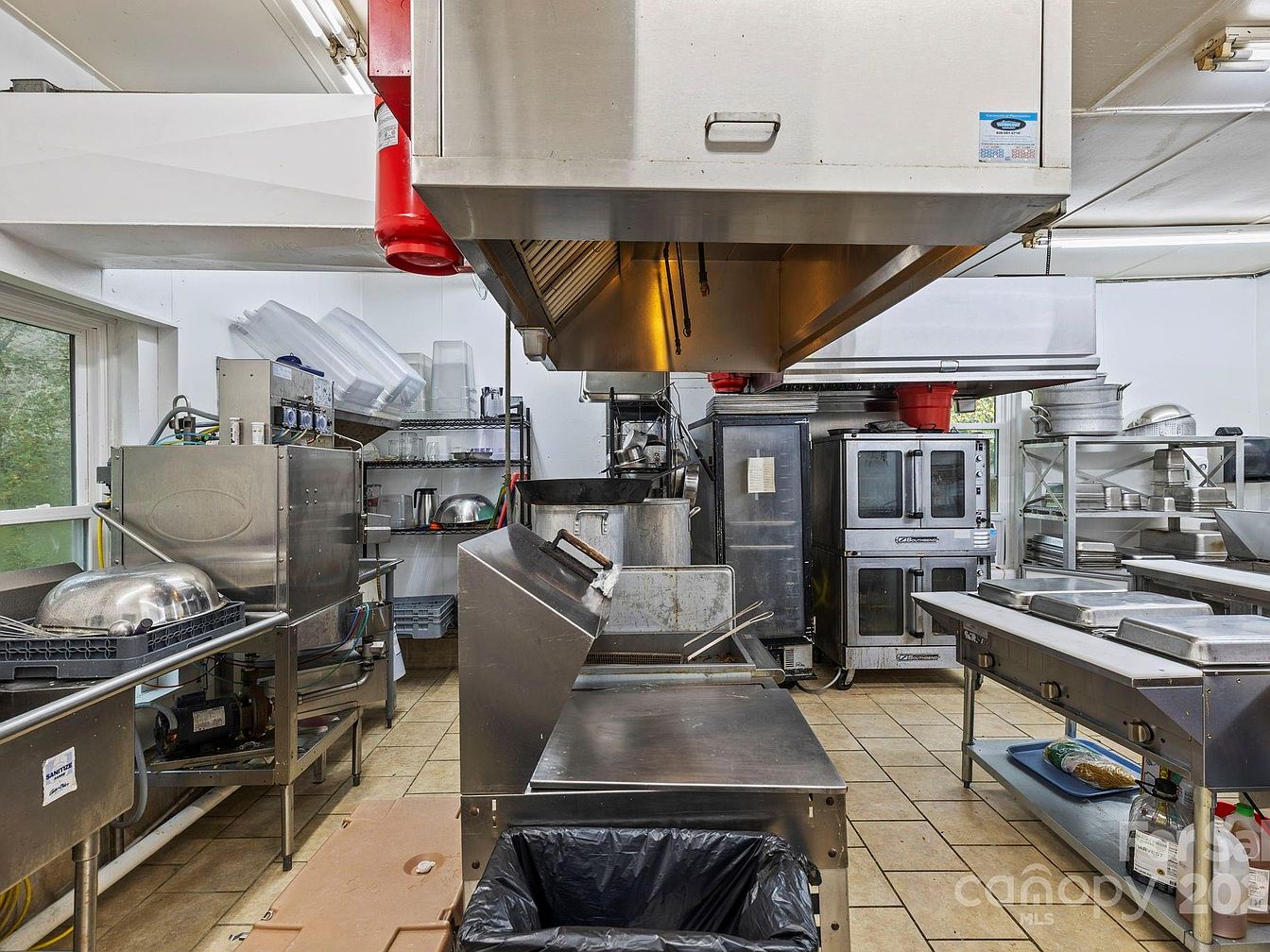 This spacious kitchen features an industrial layout with stainless steel appliances and work surfaces throughout. The floor is lined with beige ceramic tiles for easy cleaning. Large ventilation hoods dominate the ceiling, paired with red fire suppression pipes for safety. Multiple ovens, shelving units, and a professional dishwasher are visible along the walls, highlighting a functional space for large-scale cooking. Natural light streams in from sizeable windows on the left, illuminating metallic counters and various kitchenware such as pots, pans, and trays, neatly arranged on open racks. The overall atmosphere is utilitarian, with a focus on efficiency and cleanliness.