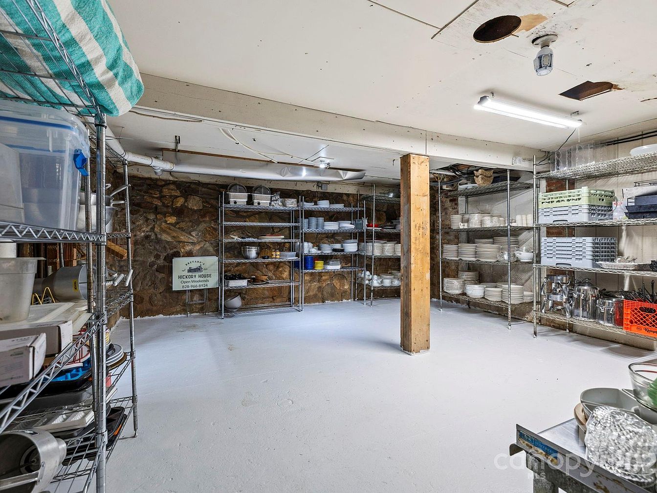 A large, utilitarian basement area with exposed stone walls and a white-painted floor, organized with several metal shelving units. The shelves are neatly stocked with dishware, cookware, trays, and various kitchen supplies, all grouped for easy access. A rough, wooden support post stands in the center, adding a rustic touch and structural support. Overhead, pipes and wiring are visible along the ceiling, alongside industrial-style lighting fixtures that bathe the space in bright, practical light. The atmosphere is clean and orderly, blending functional storage solutions with the historic charm of the stonework and wood.