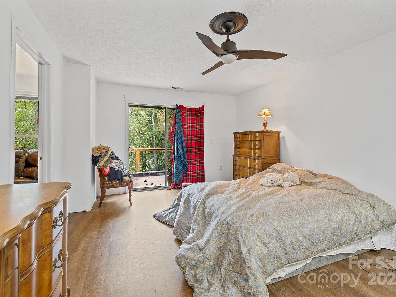 A spacious bedroom features white walls, medium-toned wood flooring, and a ceiling-mounted fan with dark blades. The room is furnished with a wooden dresser and chest of drawers, both in a classic style with ornate handles, as well as a chair near the sliding glass doors covered in clothes. The bed sits low to the ground, slightly unmade, with a decorative bedspread in a subtle muted pattern. A small lamp with a warm glow rests atop the dresser. Sliding glass doors offer access to a wooden balcony and view of lush green trees outside, introducing natural light and a sense of openness.