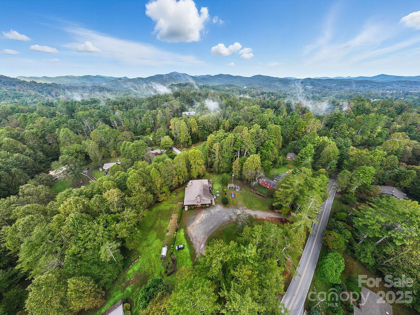 A sweeping aerial view of the estate’s spacious grounds reveals a house nestled among dense, mature trees with a mix of pines and deciduous greenery. The property sits beside a gently winding road, stretching across a verdant lawn with a gravel driveway looping in front of the main structure. Multiple buildings and homes are scattered throughout, hinting at a larger estate or cluster of residences. Mountains in the background provide a scenic natural border, softened by low-lying mist. The overall setting feels serene and secluded, with abundant green space and a tranquil, rural ambiance that embraces the natural landscape.