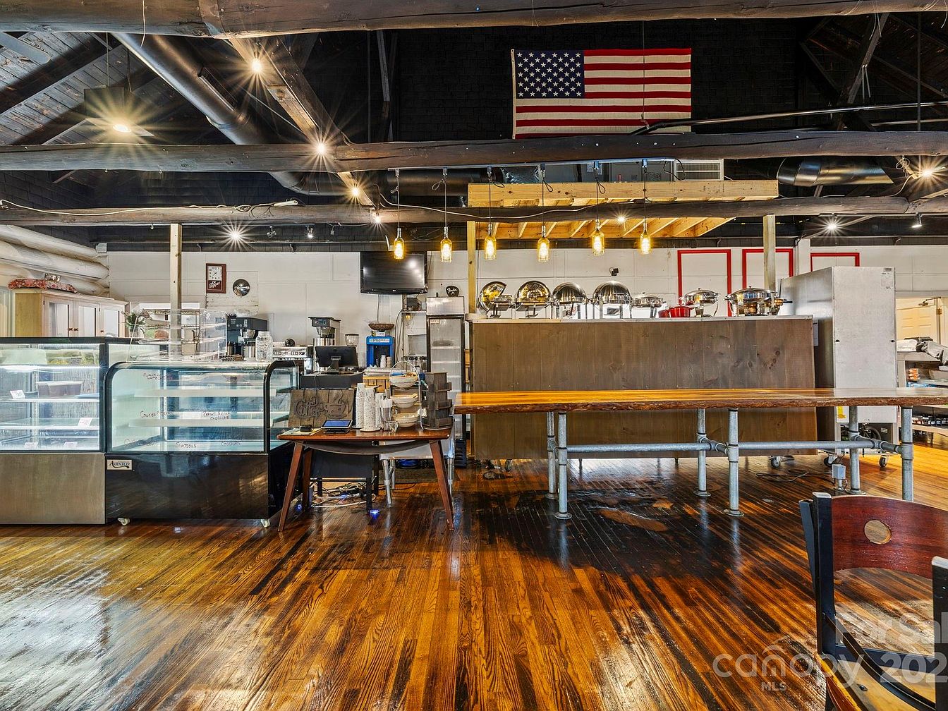 A spacious area featuring a long wooden counter with industrial metal legs, set on polished dark hardwood floors. Overhead, exposed black ceiling beams and ductwork create a rustic, industrial ambiance, complemented by warm pendant lights suspended above the counter. Stainless steel display cases and chafing dishes line the serving area, while additional appliances and shelving fill the background. A large American flag is mounted on the wall above, giving a patriotic touch. The overall color palette combines rich wood tones, brushed metal, and white walls, creating a clean yet welcoming culinary space with historical character.