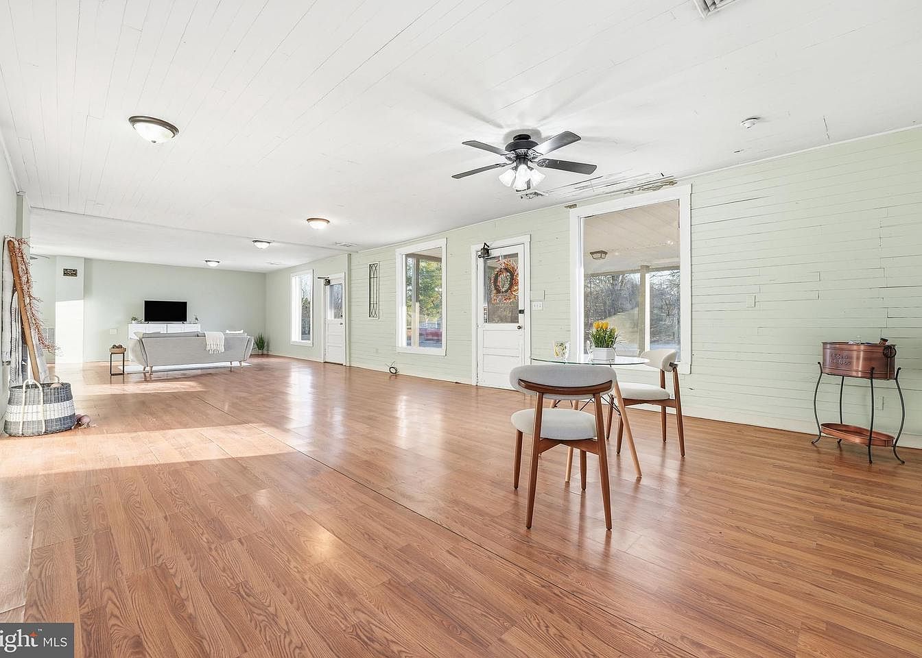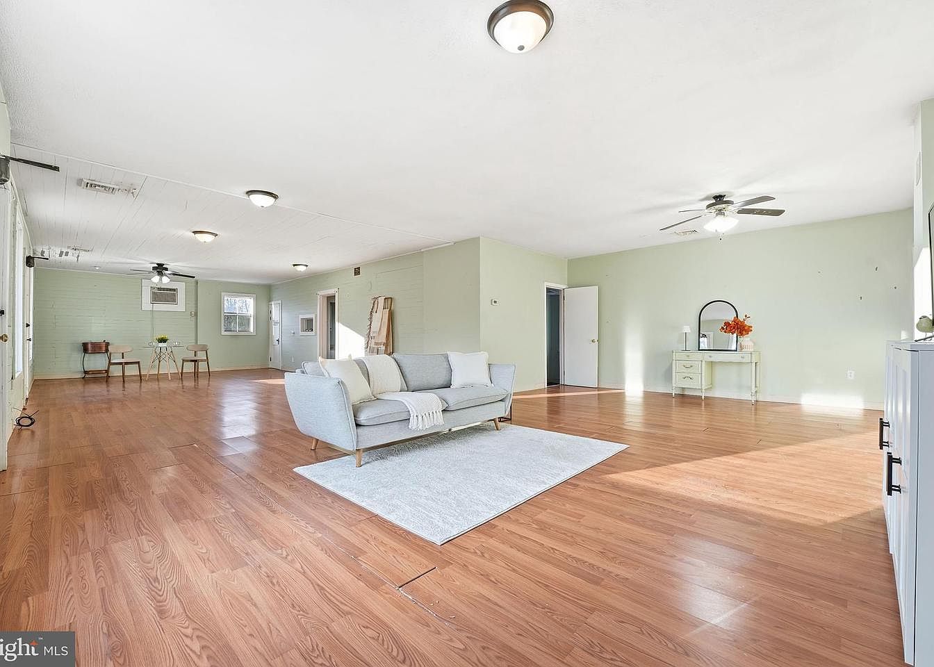 This spacious living room features a light, airy feel with pale green walls that enhance natural light streaming through large windows. The light wood laminate flooring complements the space, adding warmth and elegance. A cozy gray sofa sits centrally, accompanied by a small round dining table with two upholstered chairs, perfect for intimate meals or gatherings. The ceiling boasts a modern fan, contributing to the comfortable atmosphere. Light fixtures provide additional illumination, while decorative elements like a potted plant enhance the inviting ambiance. Doorways lead to additional spaces, emphasizing the home’s openness and inviting design.