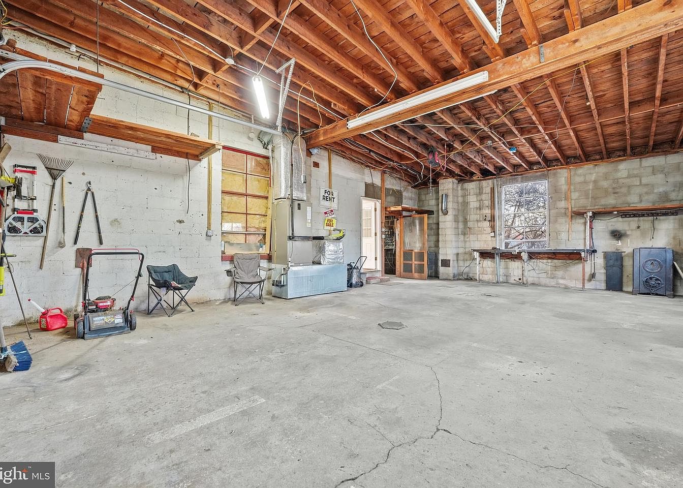 A spacious garage with a high, exposed wooden beam ceiling showcasing a rustic charm. The concrete floor is open and unadorned, providing ample space for vehicles and storage. Walls feature a combination of unfinished gray concrete and functional wooden shelving. Tools and equipment, such as a lawnmower and gardening tools, are neatly stored on wall hooks. Two folding chairs offer a casual seating area. A large window allows natural light to filter in, while fluorescent lighting enhances visibility. A doorway leads to another room, suggesting additional functionality, possibly workshop or utility space.