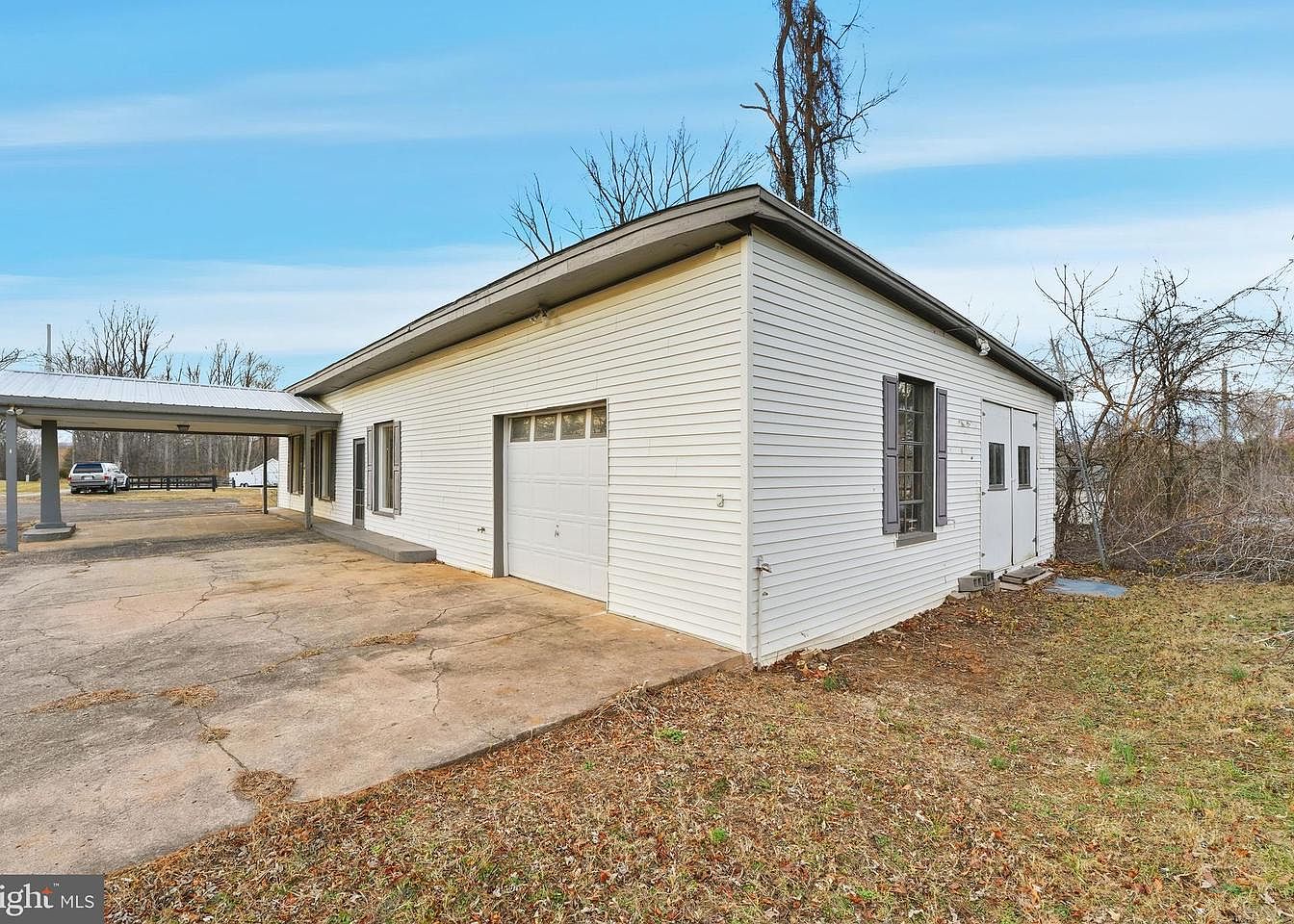 A side view of a modern home showcases a rectangular structure with a flat roof and textured white siding. A carport extends from the main building, supported by slender gray columns and featuring a light fixture. Several windows, some with air conditioning units, punctuate the facade, providing natural light to the interior. The ground is a mix of concrete and asphalt, with patches of grass and small bushes. The background reveals bare trees against a clear blue sky, enhancing the serene atmosphere of the property, while providing a contemporary feel with its clean lines and minimalistic design.