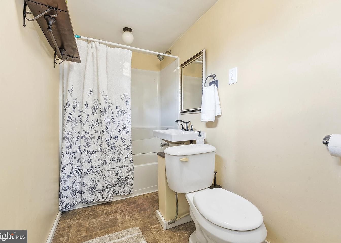 This bathroom features a compact layout with cream-colored walls that create a light and airy feel. A simple, white tub is partially covered by a floral shower curtain, adding a touch of softness. A modern wall-mounted sink with sleek black fixtures is positioned next to the toilet, which has a clean, minimalist design. Above the sink, a large mirror framed in black enhances the sense of space. Natural light is provided by a ceiling fixture, and a small shelf above the toilet offers practical storage. The flooring consists of textured vinyl tiles in neutral tones, blending seamlessly with the overall decor.