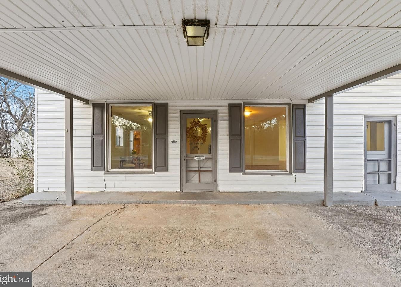 The front porch features a spacious concrete area leading up to a solid entrance door framed by large windows on either side. The windows, adorned with gray shutters, allow natural light to flood in and provide a welcoming view towards the interior. A simple welcome sign hangs on the door, enhancing the inviting atmosphere. The ceiling, paneled and white, adds a sense of height and brightness, while an overhead light fixture ensures visibility during evening hours. The adjacent wall shows a hint of greenery, blending outdoor elements with the architectural simplicity of the historic home.