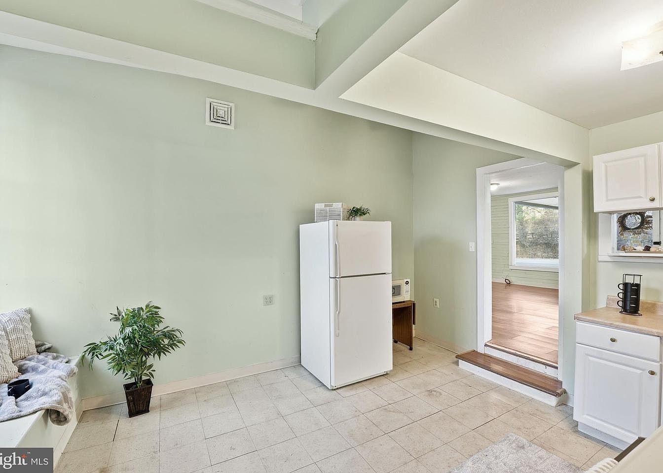 This kitchen area features a pale green color scheme, creating a fresh and inviting atmosphere. A white refrigerator stands prominently against the wall, complemented by a wooden table holding a microwave and a decorative plant. Light tile flooring transitions smoothly to a small step leading to another room, enhancing accessibility. Natural light streams in from an adjacent space, highlighting the simplicity and functionality of the design. The architecture includes airy ceilings with exposed beams, adding character. Soft furnishings such as a cozy blanket on a bench provide comfort, making the space feel warm and welcoming.