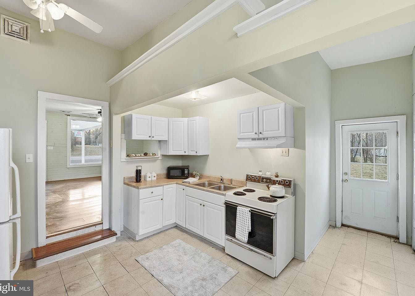 This kitchen features light green walls that enhance the airy atmosphere, complemented by white cabinetry and a light wood countertop. A compact layout includes a double sink adjacent to a vintage-style stove topped with burners. A microwave is neatly placed on the counter, providing convenience. Natural light pours in from the door, which leads to the outside, emphasizing the spaciousness. The ceramic tile floor offers a practical yet elegant touch, and a soft area rug in front of the sink adds warmth. The overall design embodies a blend of modern functionality with subtle classic charm, ideal for cooking and gathering.