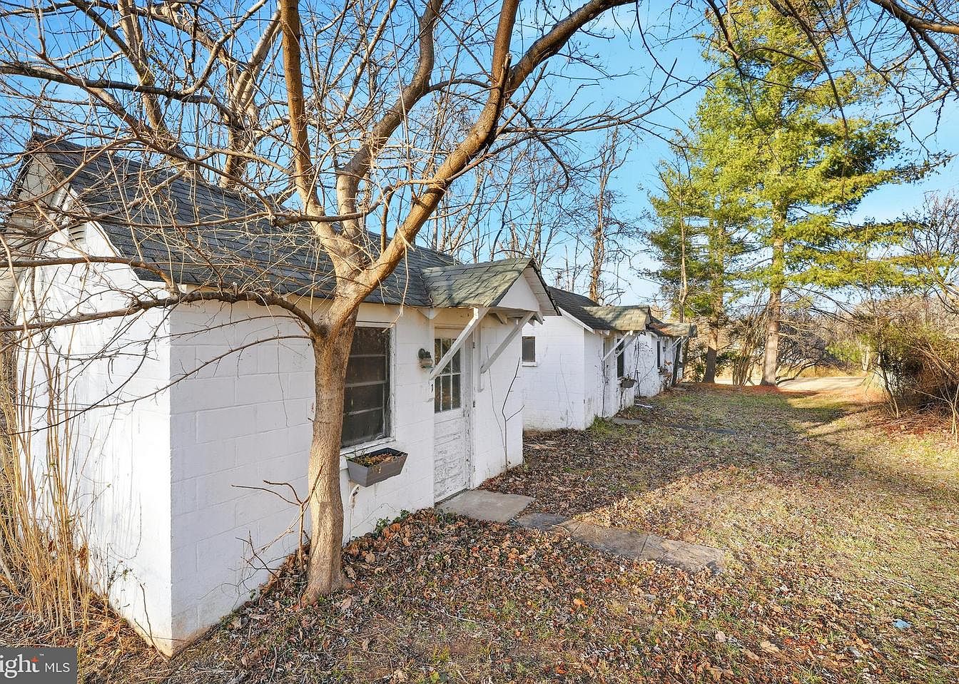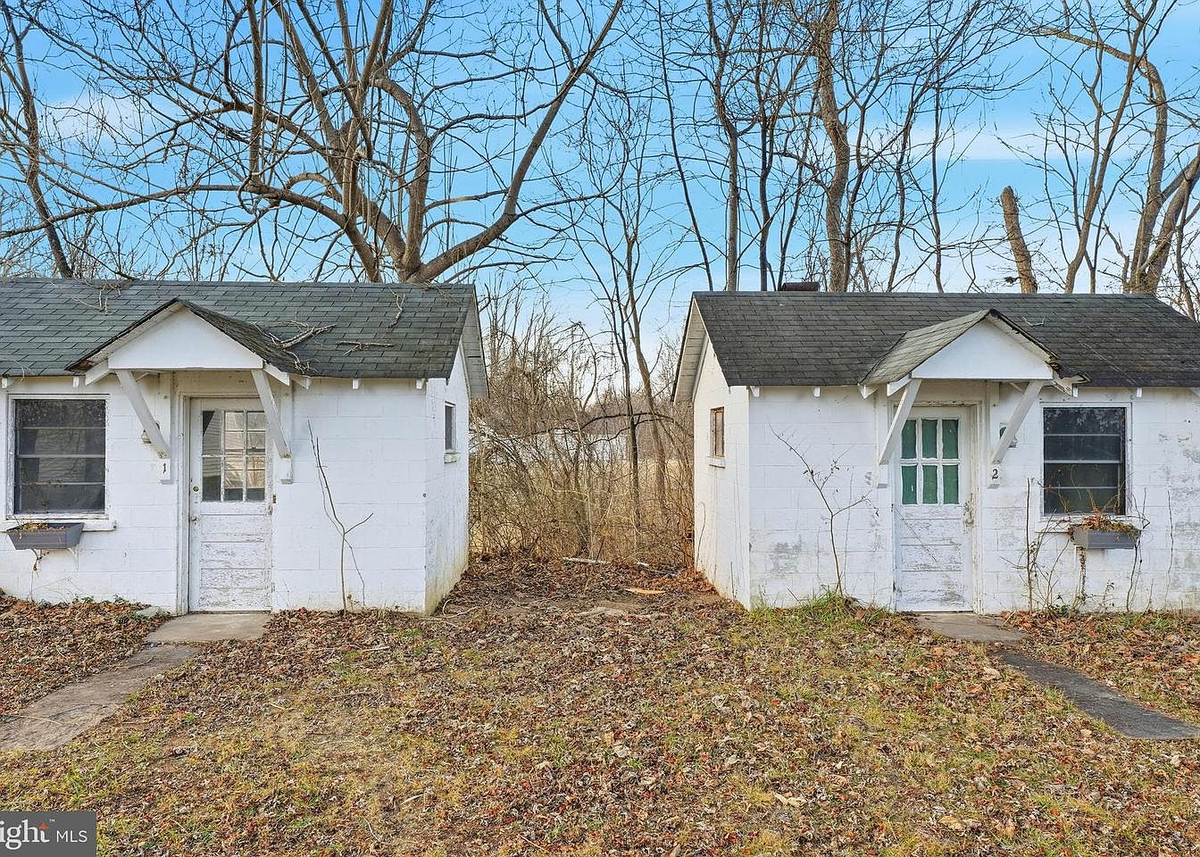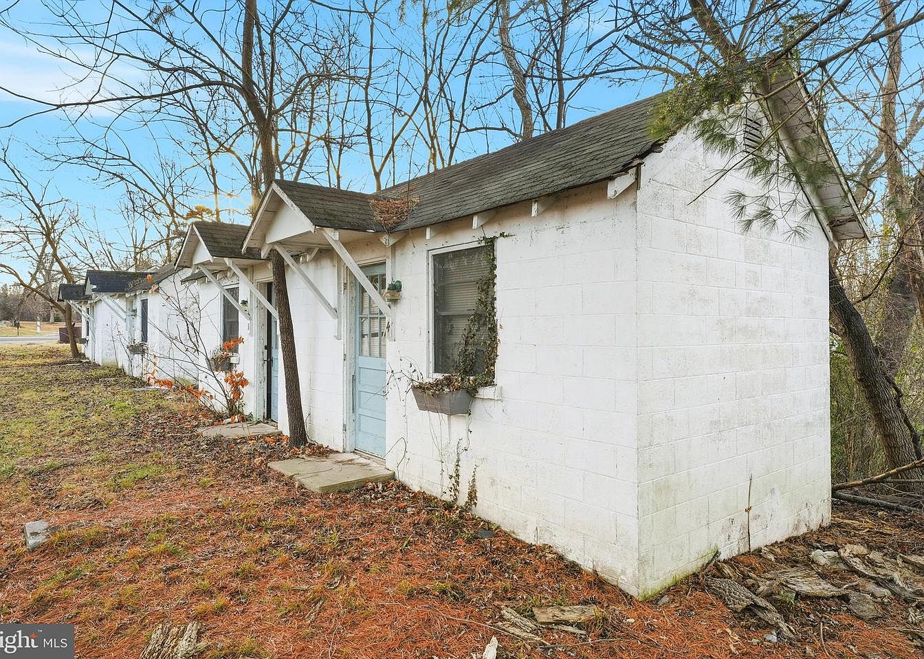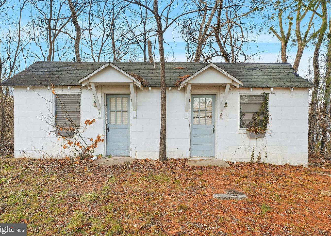 A quaint two-door cottage with whitewashed cinder block walls, nestled among bare trees. The structure features a rustic pitched roof, clad in dark shingles with visible patches of wear. Each entrance is marked by a sky-blue door, adorned with glass panels, allowing glimpses into the interior. One side shows a window with muted blinds and a small flower box, hinting at past gardening efforts. The front yard is overlaid with brown pine needles, indicating a natural landscape intertwined with seasonal transitions. Overall, the aesthetic exudes a nostalgic charm, reminiscent of simpler times.