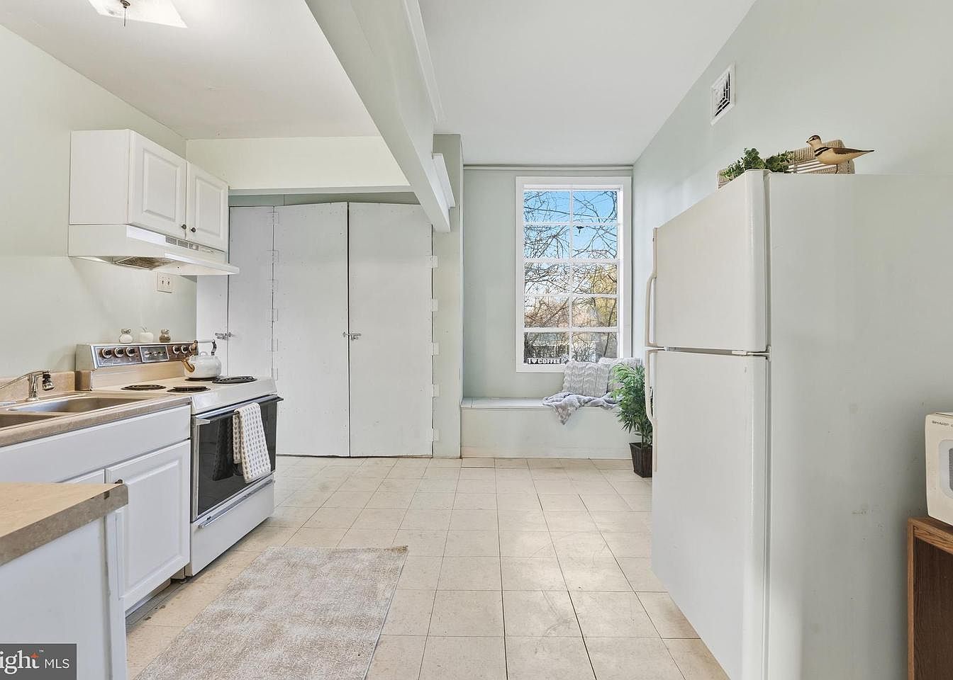 A quaint kitchen showcasing a light, airy atmosphere. The walls are painted a soft mint green, complementing the white cabinetry that features simple, classic hardware. A spacious countertop merges with a stove and oven unit, while a neatly organized refrigerator stands nearby. Large windows invite natural light, highlighting a charming window seat adorned with pillows and a cozy throw blanket. The flooring is tiled in a neutral beige, enhanced by a textured area rug that adds warmth. Practical wooden doors lead to storage, ensuring the space remains uncluttered, while decorative touches bring character to the room.