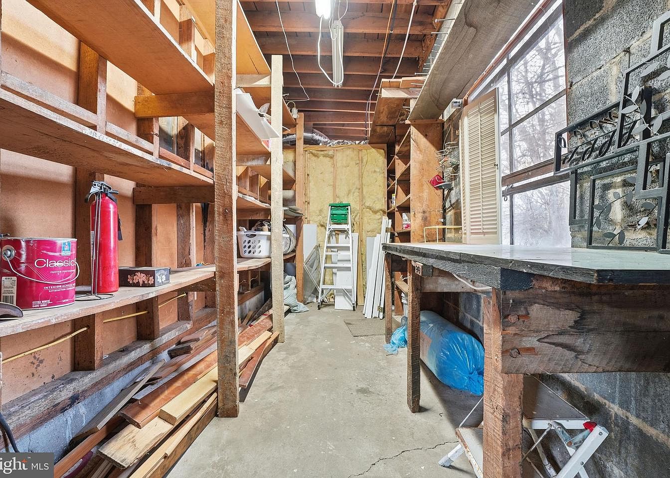 A narrow storage room features wooden shelving along both sides, showcasing a rustic charm. The walls are a mix of wooden panels and exposed stone, giving it a historic feel. A concrete floor provides durability, with various tools and materials scattered, including a paint can and a fire extinguisher. On the right, a sturdy work table is positioned beneath a large window, allowing natural light to filter in. Visible items include a ladder, plastic storage bins, and a plastic-wrapped object, contributing to the functional yet cluttered aesthetic that suggests practicality and utility.