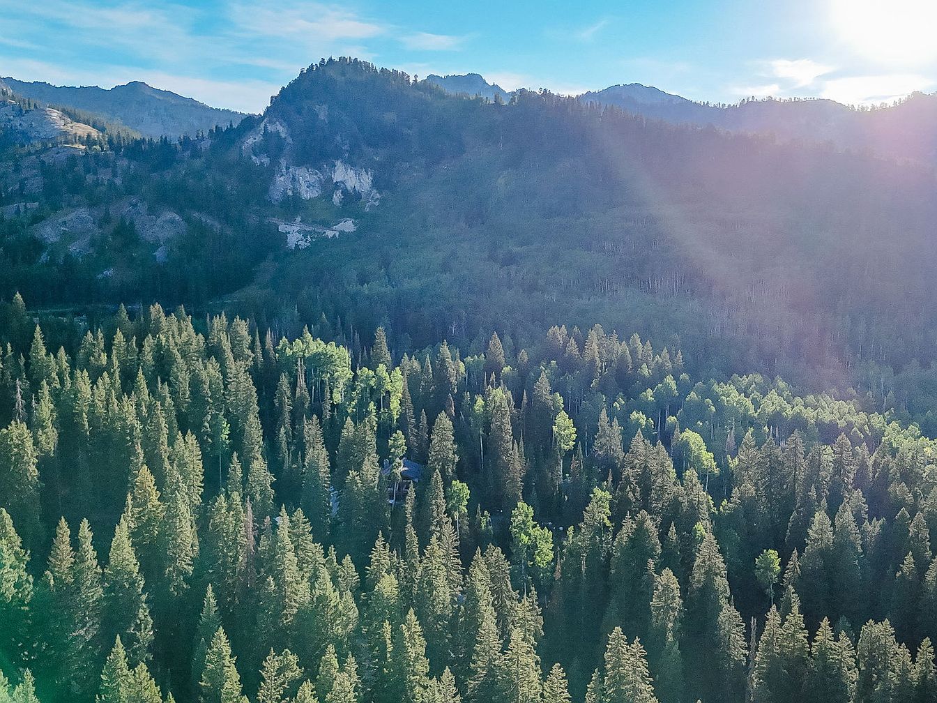 A breathtaking aerial view captures a secluded home nestled among a dense forest of tall evergreens and lush green trees, set against the dramatic backdrop of rolling mountain peaks. Perfect for families seeking peace and privacy, the area offers plenty of open space for outdoor recreation and exploring nature. The house is discreetly positioned within the trees, providing a sense of safety and tranquility. The natural landscape features a vibrant mix of green hues, soft sunlight streaming through the treetops, and the expansive blue sky above, creating an inviting, serene environment for children and adults to enjoy together.