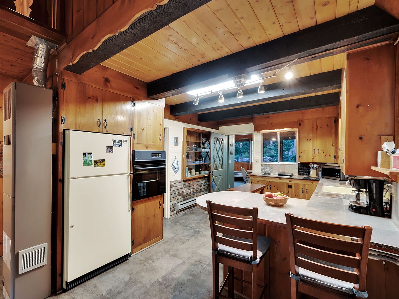 Warm and inviting kitchen featuring natural wood-paneled cabinets and walls, complemented by exposed dark ceiling beams and a light wood plank ceiling for a cozy, rustic charm. The U-shaped layout includes ample counter space, a built-in oven, and a vintage cream refrigerator, making it highly functional for family cooking and gatherings. Two wooden bar stools at the breakfast bar provide a casual spot for meals and conversation. Large windows and a glass door fill the space with natural light, while track lighting offers ample brightness in the evenings. The overall palette is earthy and welcoming, ideal for family activities and gatherings.