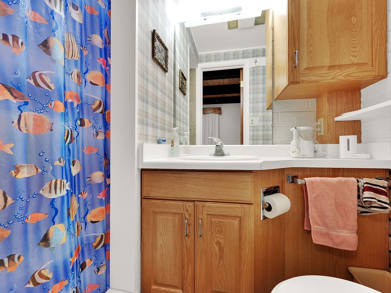 A cozy bathroom features a playful, ocean-themed blue shower curtain covered with colorful fish, ideal for families with young children. The vanity has bright wood cabinetry and a white countertop with a simple sink, topped with a large mirror that reflects the wallpapered walls in a subtle plaid pattern. Soft, child-friendly touches include neatly hung pink and striped towels and a conveniently placed toilet paper holder. Built-in wooden cabinets offer ample storage, keeping essentials out of reach for safety. The neutral and soft color palette, combined with thoughtful storage and whimsical décor, creates a welcoming, practical space for every family member.