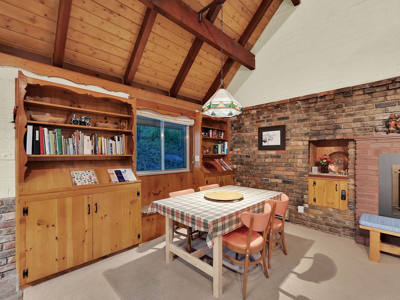 Warm and inviting dining space nestled under a vaulted, wood-paneled ceiling with exposed beams, creating an airy yet cozy atmosphere perfect for family gatherings. The area features a spacious rectangular table covered with a plaid tablecloth, surrounded by four wooden chairs with cushioned seats. Built-in shelves and lower cabinets provide ample storage for books, games, and family mementos. Large windows offer natural light and a view to the outdoors. A decorative stained-glass pendant lamp hangs above the table, while the brick accent wall with a recessed shelf and a small cupboard adds both rustic charm and practical storage. Soft carpet flooring completes the comfortable, homey vibe.
