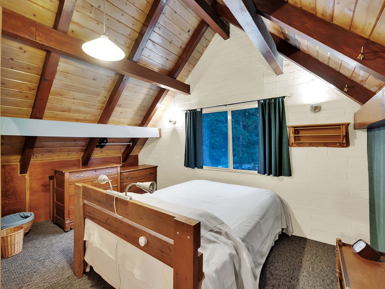 A warm and inviting bedroom nestled under a pitched, exposed wood beam ceiling, radiating rustic charm and comfort for families. The space features a large window with deep green curtains, allowing natural light to brighten the white brick walls and offering serene views outdoors. Rich, honey-tone wood is used for the sturdy bedframe, matching dressers, and trim, creating a unified and welcoming atmosphere. Soft, neutral carpeting covers the floor, providing a cozy area for children to play safely. Well-chosen lighting ensures the room feels open and bright, making it perfect for family relaxation or a restful night’s sleep.