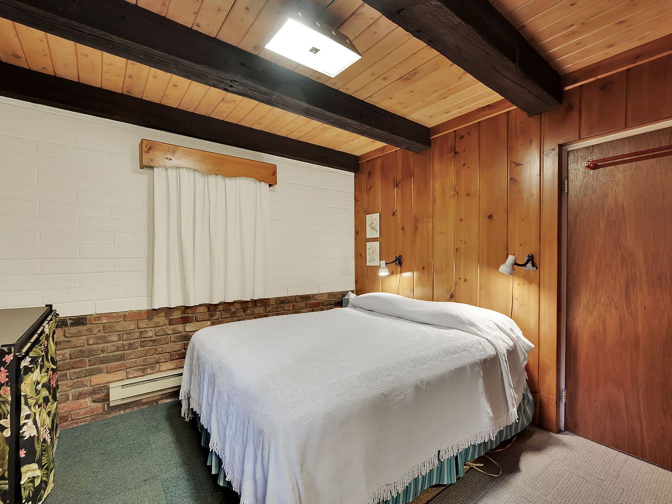 A warm and inviting bedroom with rustic charm, featuring wood-paneled walls and a matching wooden ceiling with prominent exposed beams. The comfortable bed is covered with a crisp white textured blanket, offering a sense of cleanliness and relaxation. Family-friendly adjustable reading lamps are fixed to the wall, creating an ideal spot for nighttime stories. The flooring is carpeted and soft underfoot, suitable for children and adults alike. A small window with cream curtains is framed by brick and painted white brickwork, adding texture and character. Soft, earthy tones throughout the space promote a calm and welcoming atmosphere for any family.