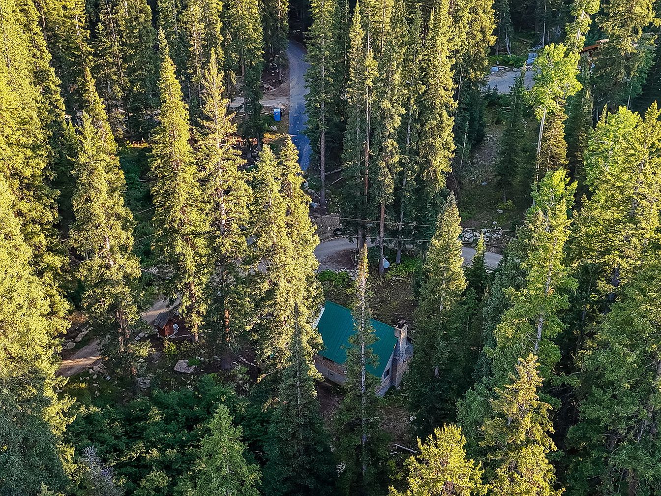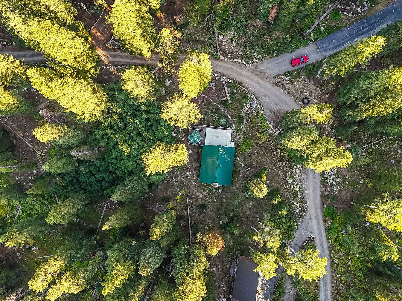 Nestled deep within a lush forest, this home’s backyard features a wooden deck covered by a vibrant teal umbrella, offering a shaded spot for outdoor family gatherings. Tall pine trees surround the yard, creating privacy and a tranquil atmosphere ideal for children to play and explore safely. The lawn is mostly natural, with a mix of grassy clearings and stone paths. The green metal roof of the house blends harmoniously with the surrounding foliage, complementing the home’s rustic cabin style. This backyard provides a peaceful, nature-filled retreat perfect for family barbecues, outdoor games, and relaxation amidst towering trees.