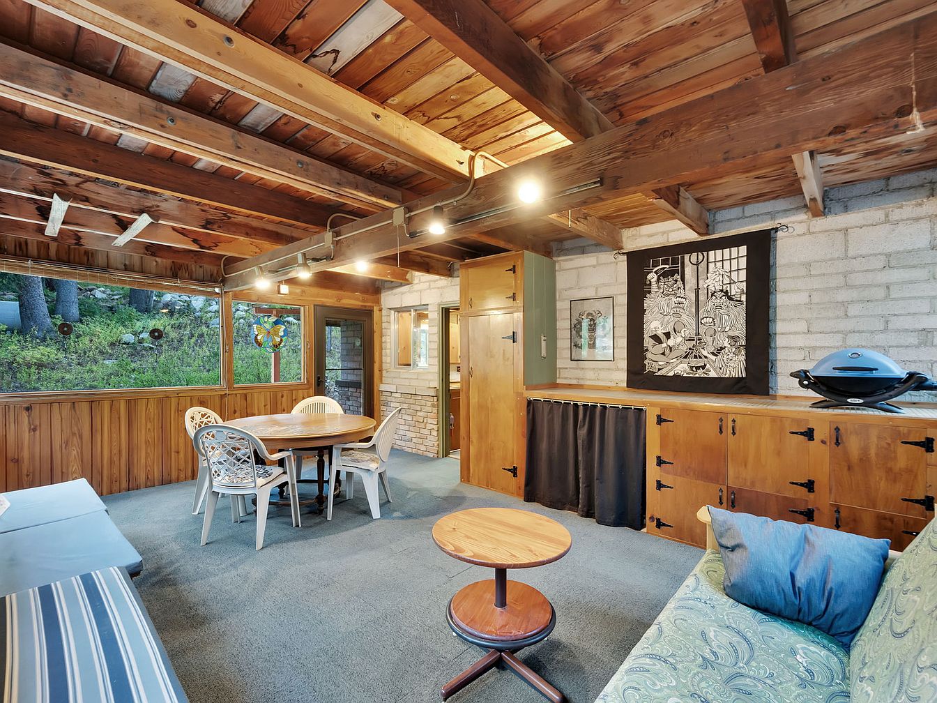 A spacious sunroom features warm wooden ceiling beams, paneled walls, and neutral carpeting, creating a cozy yet airy atmosphere filled with natural light from large windows that showcase views of lush greenery. The room is arranged with a round wooden dining table surrounded by a mix of cushioned and plastic chairs, ideal for family meals, games, or crafts. Built-in cabinetry with unique hardware lines one wall, providing ample storage, while a futon with patterned upholstery adds a comfortable seating area. Artistic accents and a small grill enhance the space, making it both inviting and practical for family gatherings and relaxation.