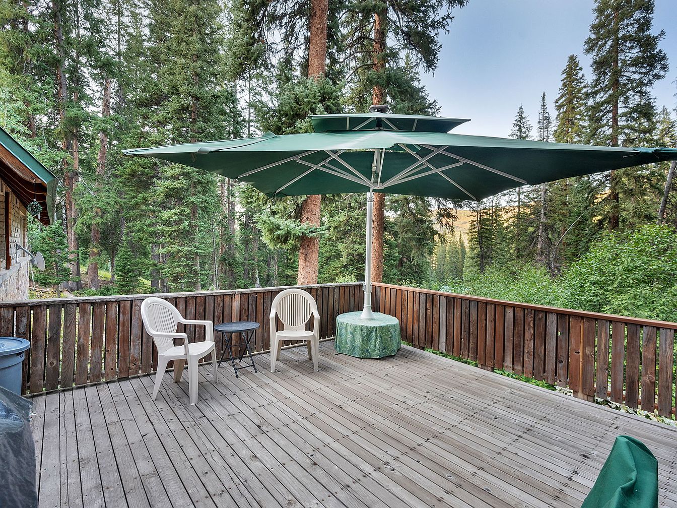 Spacious wooden deck bordered by a rustic brown railing, set against a lush forest backdrop. The area features two sturdy white plastic chairs with slatted backs, paired around a small black metal table, perfect for casual outdoor gatherings. A large green umbrella provides ample shade, ensuring comfort on sunny days, and is anchored in the center with a round base. The deck’s planked flooring offers plenty of room for children to play or for family seating arrangements. Surrounded by tall trees, the setting creates a serene, family-friendly retreat that seamlessly connects indoor living to nature.