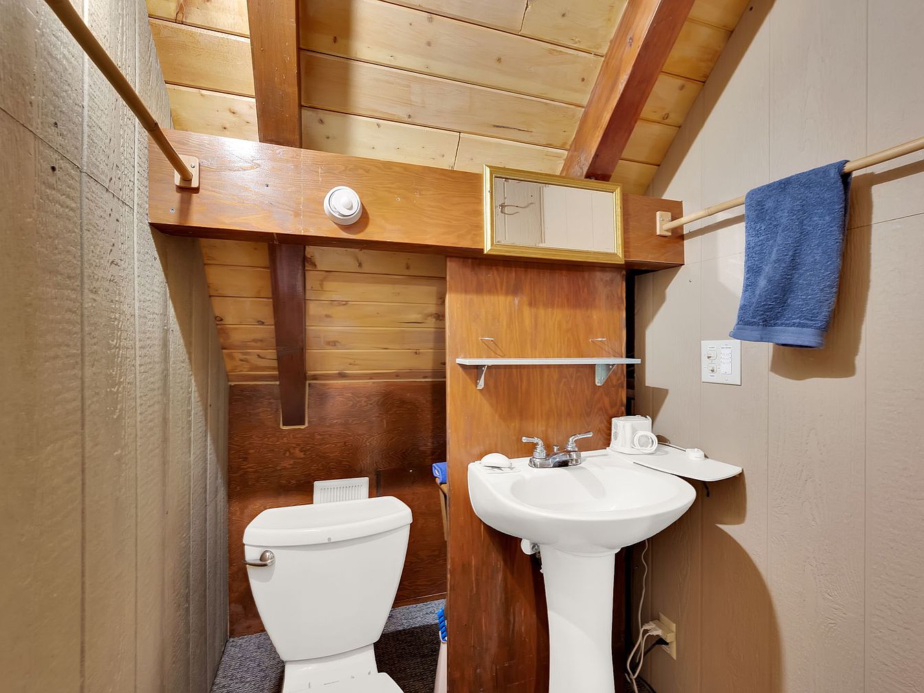 A cozy and functional bathroom nook positioned beneath a sloped wooden ceiling with exposed beams, creating a warm and rustic cabin charm. The room features a white pedestal sink paired with a simple round mirror and a floating glass shelf above, ideal for storing toiletries. Adjacent to the sink is a standard white toilet with a chrome handle. The light brown, textured wood-paneled walls enhance the natural look, while neutral tones make the space inviting for family members. A blue towel hangs on a wooden rod, adding a pop of color and easy access for children or guests.