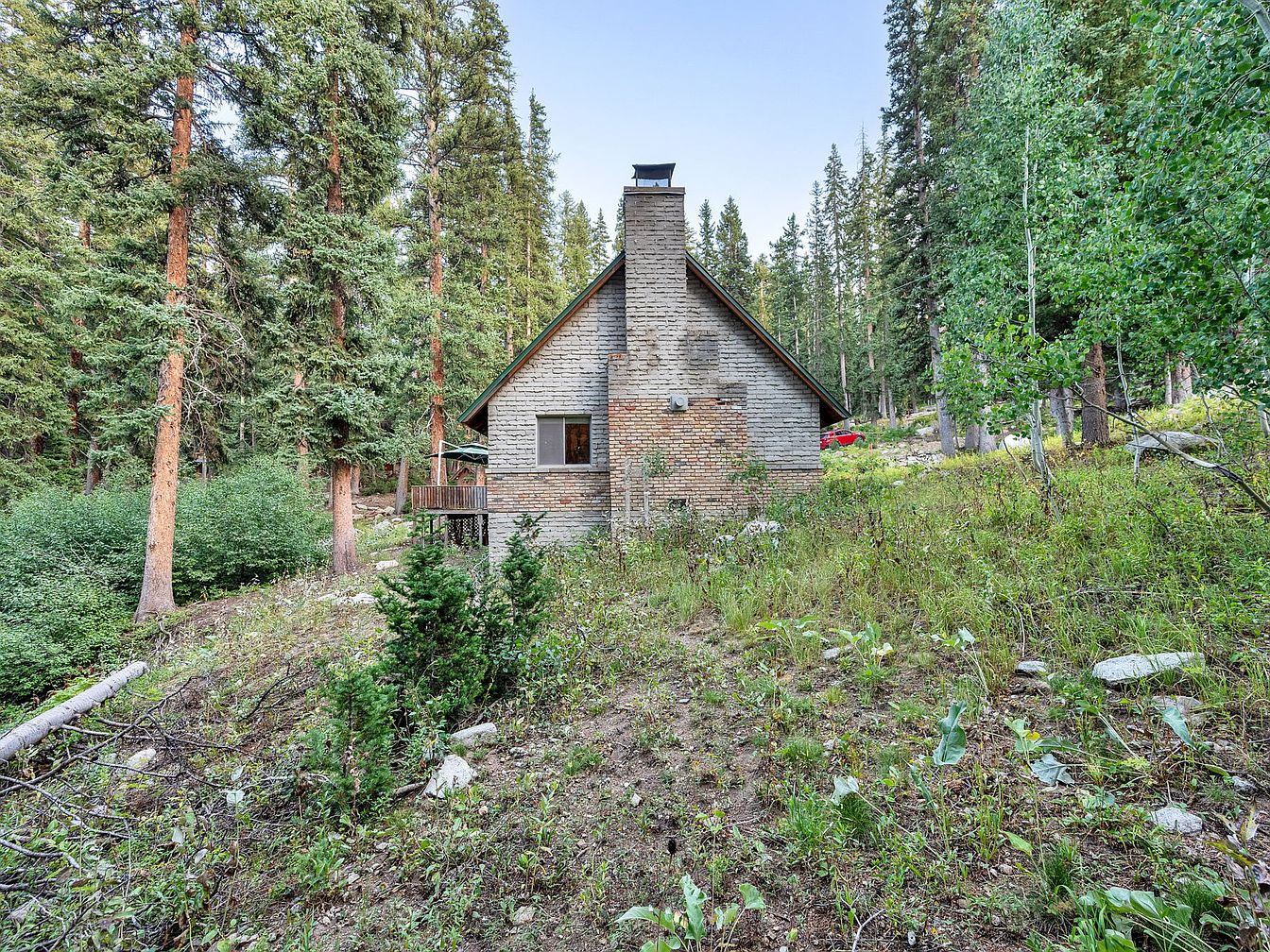This photograph displays the backyard view of a rustic American home surrounded by a dense forest of tall pine and aspen trees. The house features a brick façade with a prominent central chimney and a sloping roof that blends seamlessly with its natural setting. There is a wooden deck extending from one side of the home, ideal for outdoor family gatherings and children to safely play while parents relax. The yard is spacious with scattered wild grasses, small shrubs, and patches of natural ground cover, offering an inviting, low-maintenance environment that encourages exploration and outdoor activities for families.