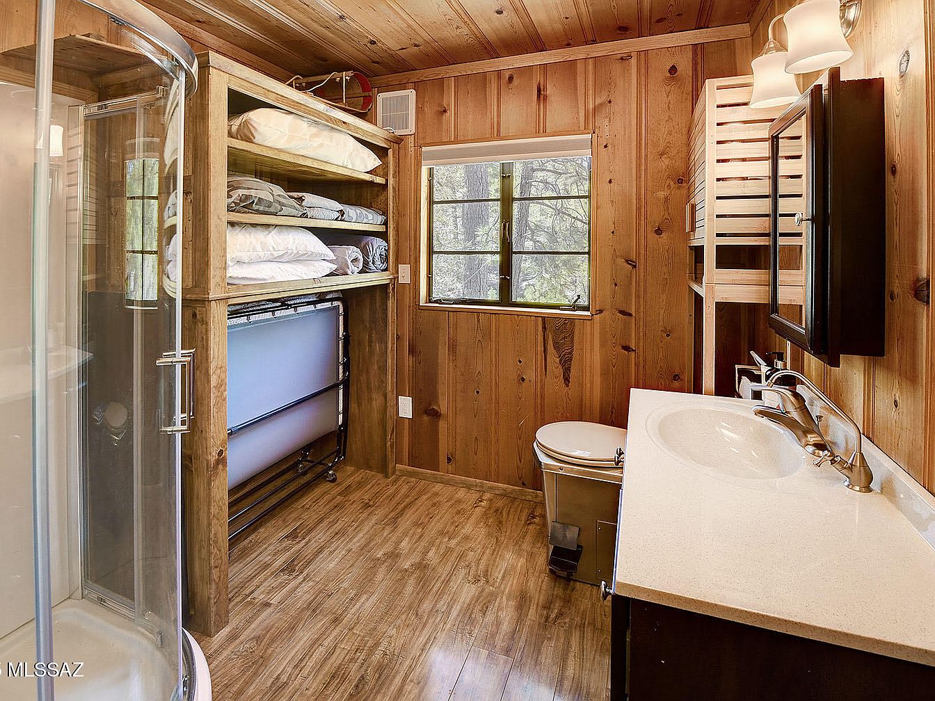 This inviting bathroom features warm wood paneling on the walls and ceiling, creating a cozy, cabin-like atmosphere that’s perfect for a family retreat. The space is practical with a sturdy shelving unit holding neatly folded bedding and a portable cot, offering flexible sleeping arrangements for children or guests. A modern glass-enclosed shower sits to the left, ideal for family use, while a white countertop vanity with generous workspace, under-sink storage, and a matching mirror cabinet adds convenience. Natural light streams in through a window above the toilet, enhancing the airy, nature-inspired ambiance of this well-organized, family-friendly bathroom.