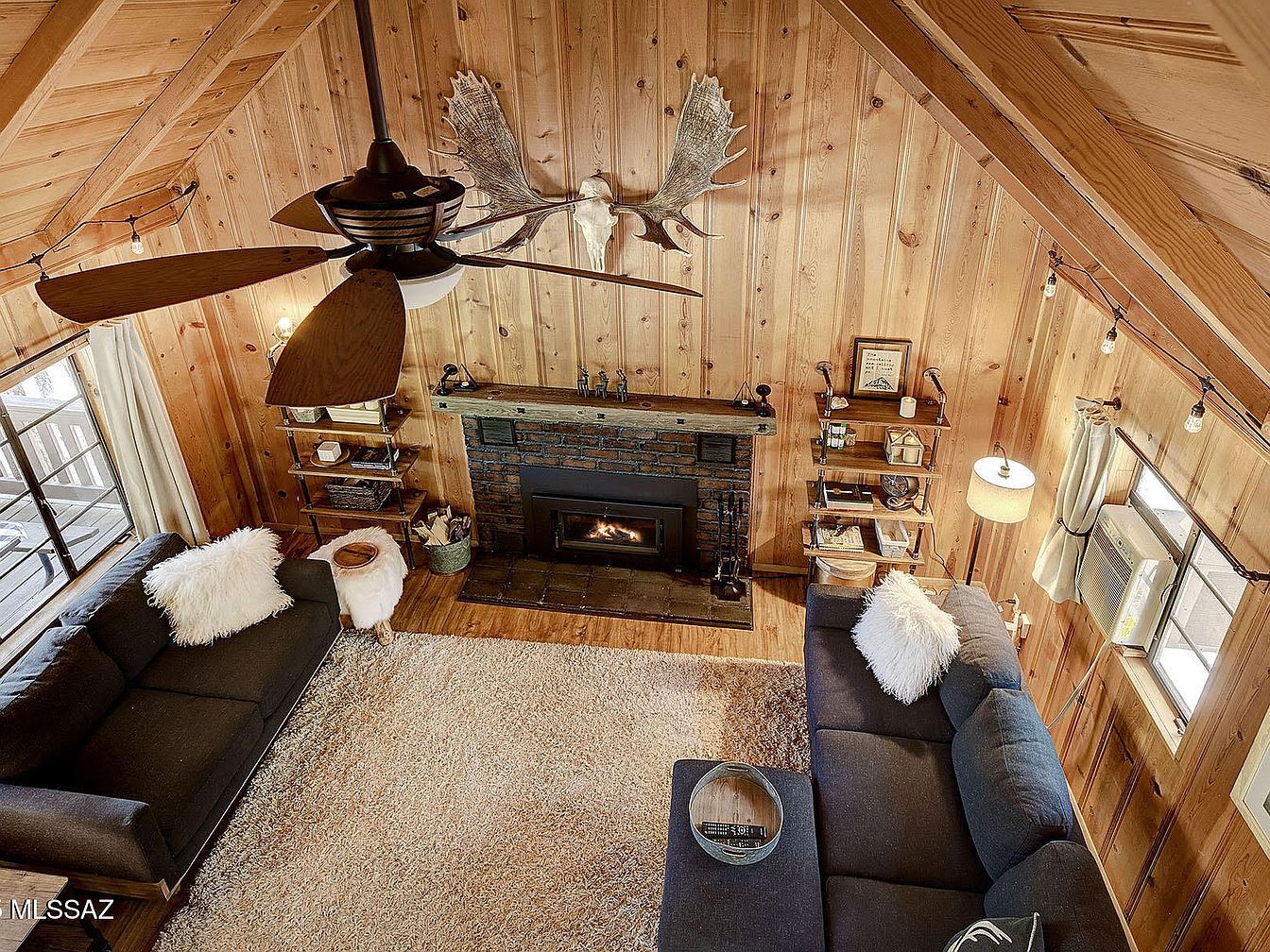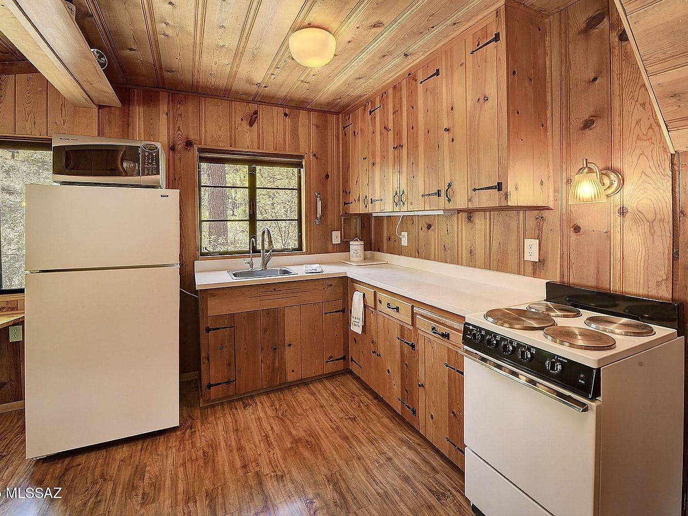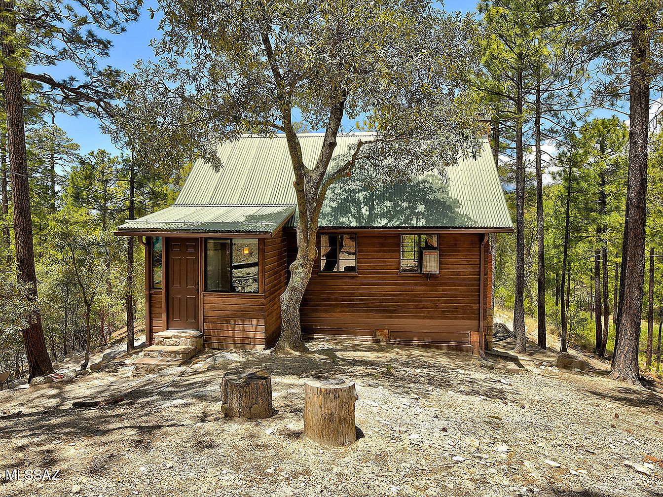 Nestled at 7,000 feet among mature oaks and pines in Willow Canyon, just 16 miles up Mt Lemmon Hwy in Mount Lemmon, AZ, this historic Craftsman cabin artfully blends early 20th-century charm with modern updates. Built to exude rustic warmth, it features old-growth knotty pine walls, custom kitchen cabinetry, and a classic vaulted living room, perfect for family gatherings and tranquil getaways. Recent renovations include updated electrical service, new laminate flooring, an upgraded wood-burning fireplace, and a fully equipped kitchen. Sold mostly furnished and boasting a large porch with forest views, this retreat offers access to hiking, fishing at Rose Canyon Lake, and serene relaxation. The property is listed at $239,500 and sits on Forest Service land with an annual permit fee.