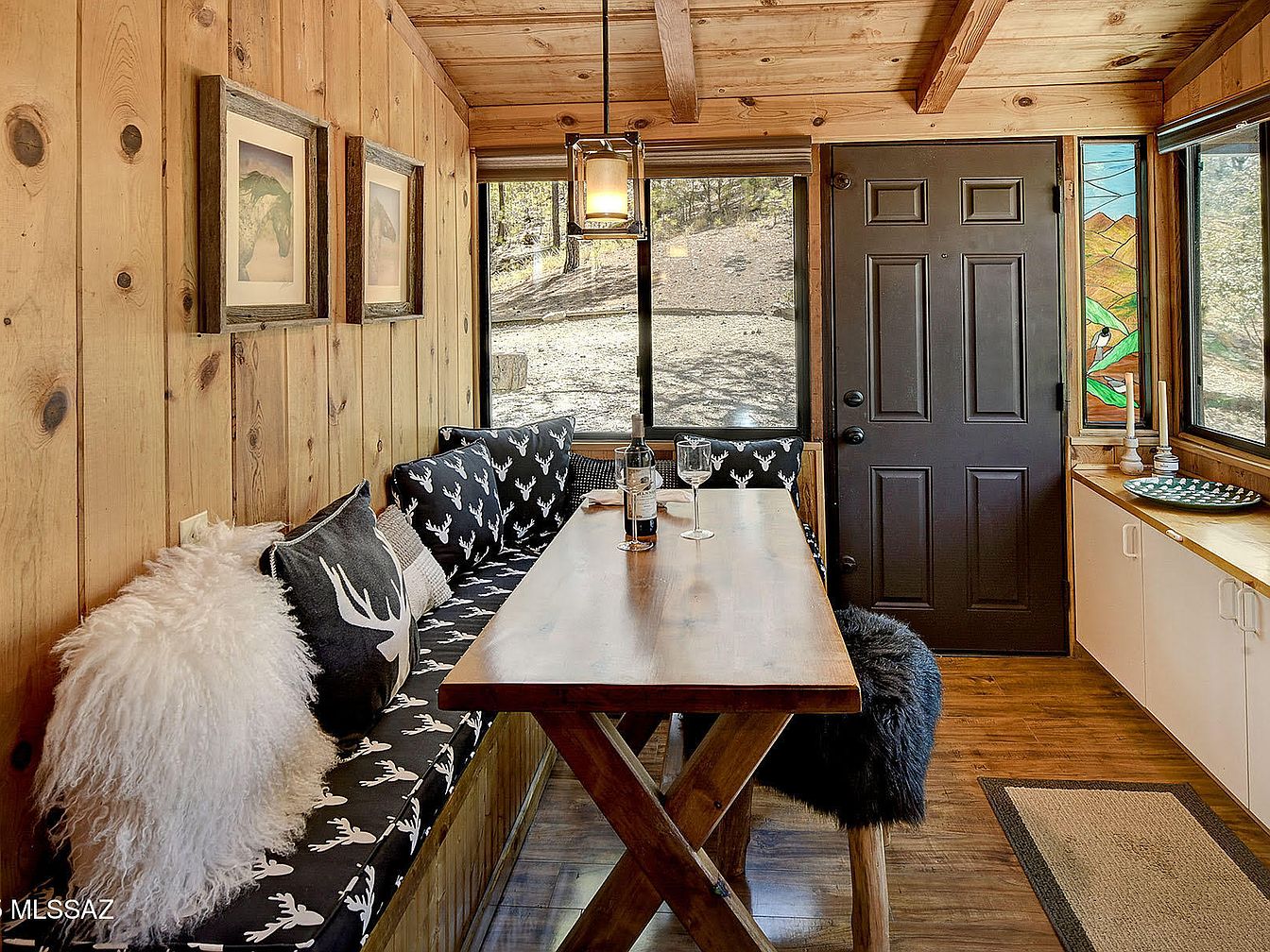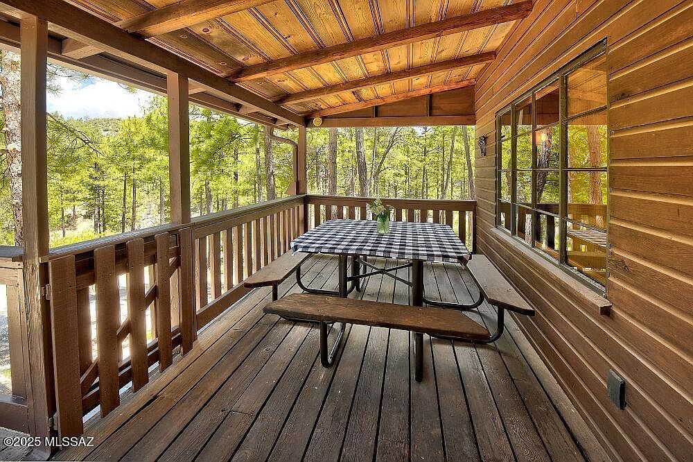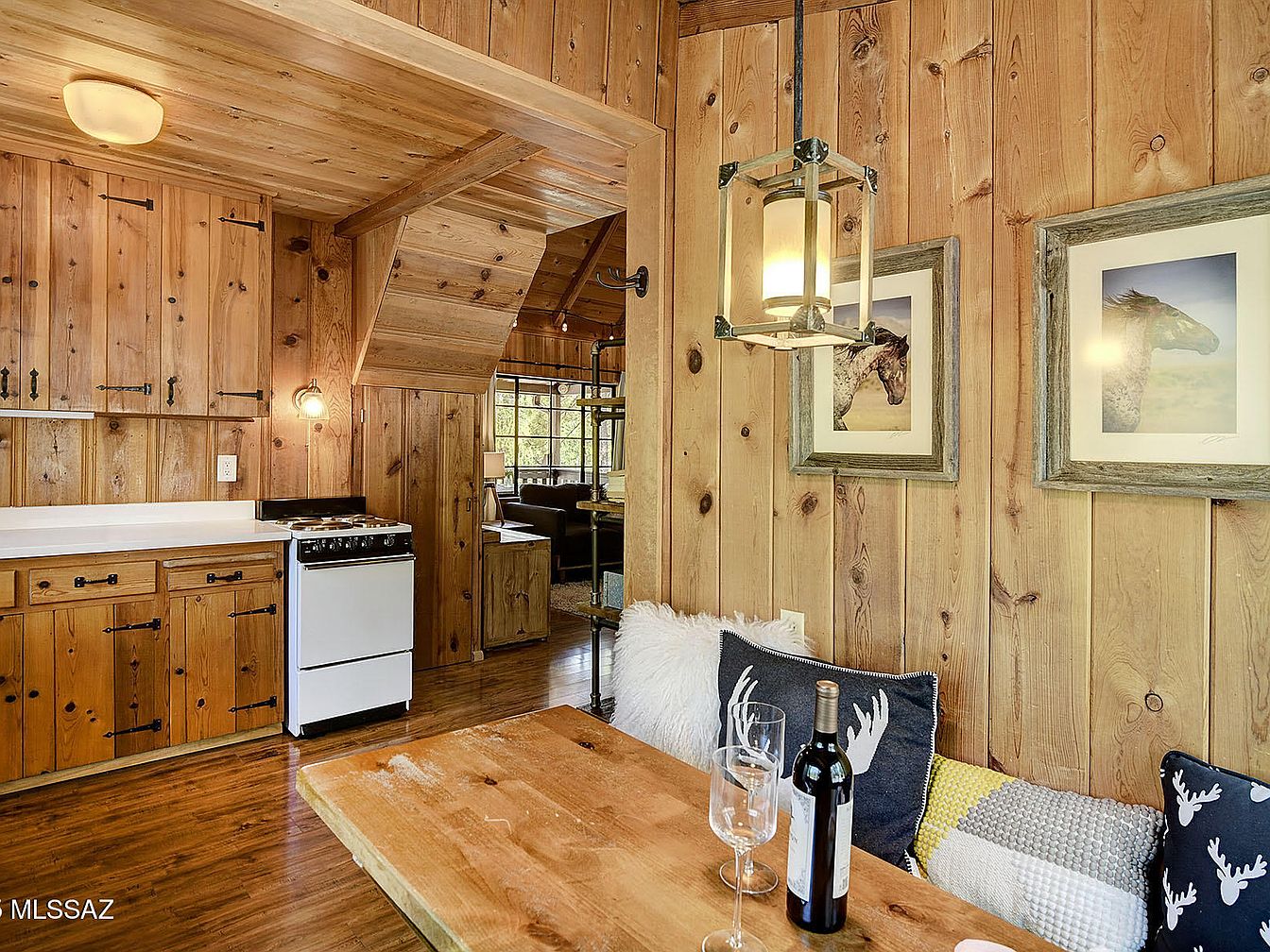 Nestled at 7,000 feet among mature oaks and pines in Willow Canyon, just 16 miles up Mt Lemmon Hwy in Mount Lemmon, AZ, this historic Craftsman cabin artfully blends early 20th-century charm with modern updates. Built to exude rustic warmth, it features old-growth knotty pine walls, custom kitchen cabinetry, and a classic vaulted living room, perfect for family gatherings and tranquil getaways. Recent renovations include updated electrical service, new laminate flooring, an upgraded wood-burning fireplace, and a fully equipped kitchen. Sold mostly furnished and boasting a large porch with forest views, this retreat offers access to hiking, fishing at Rose Canyon Lake, and serene relaxation. The property is listed at $239,500 and sits on Forest Service land with an annual permit fee.