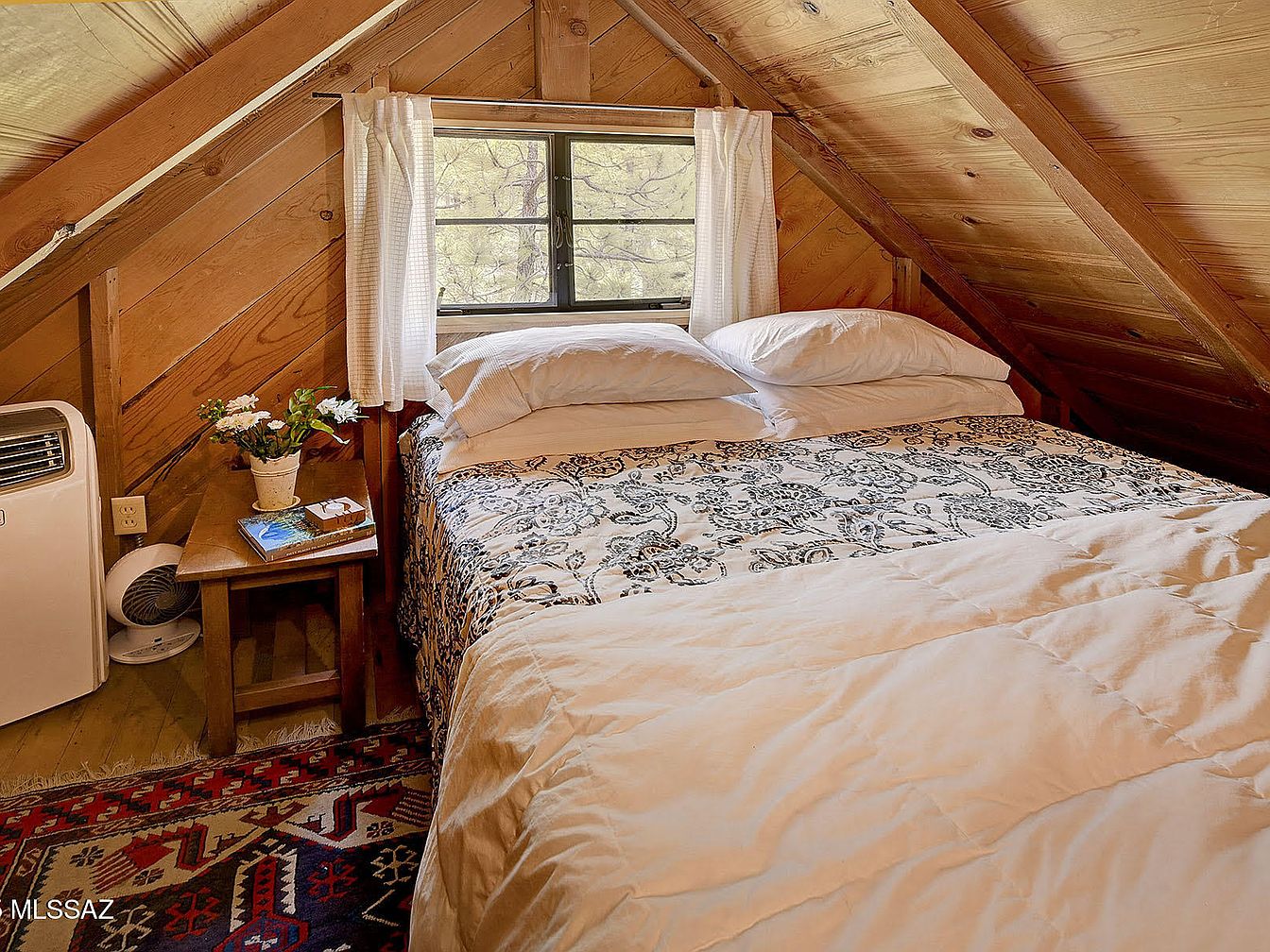 A charming attic bedroom features warm, slanted wooden walls and exposed beams, creating a rustic, inviting ambiance ideal for family relaxation. A comfortable bed with patterned bedding sits beneath a window framed with light curtains, allowing soft natural light to fill the space. A small wooden nightstand next to the bed holds a vase of fresh flowers and a book, adding a touch of homeliness and making the area perfect for reading or unwinding. A patterned rug in red and blue provides warmth and color, while a portable air conditioner ensures comfort year-round. This practical design offers a snug, peaceful retreat for family members.