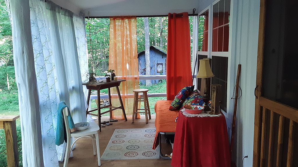 A cozy sunroom filled with natural light, featuring large windows framed by sheer white and vibrant orange curtains. A warm wooden floor contrasts with a light area rug adorned with circular patterns. In one corner, a rustic wooden table and a stool invite casual gatherings. A bright orange couch, decorated with colorful pillows, provides a comfortable spot for relaxation. A lamp and a small table adorned with a lace doily add charm to the space. The lush greenery outside creates a serene backdrop, enhancing the room’s peaceful ambiance and inviting outdoor elements inside.