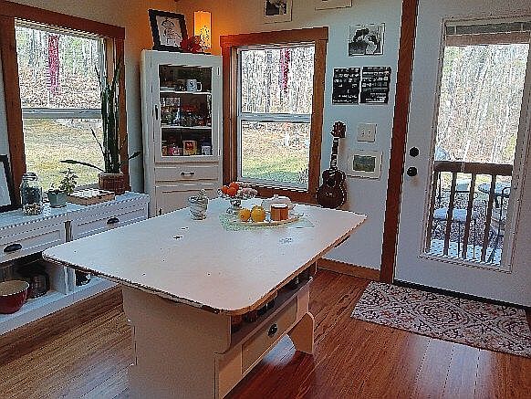 This cozy kitchen nook features a central white table adorned with fresh fruits, creating a vibrant focal point. Natural light streams through two large windows, accented by wooden trim that complements the honey-colored hardwood floor. A charming cabinet filled with glassware and decorative items stands against one wall, offering a touch of personal flair. Next to it, a guitar leans casually, hinting at leisure moments. The entrance door leads to an outdoor space, framed by a patterned rug that adds warmth. Overall, a harmonious blend of function and comfort, emphasized by a warm, inviting color palette.