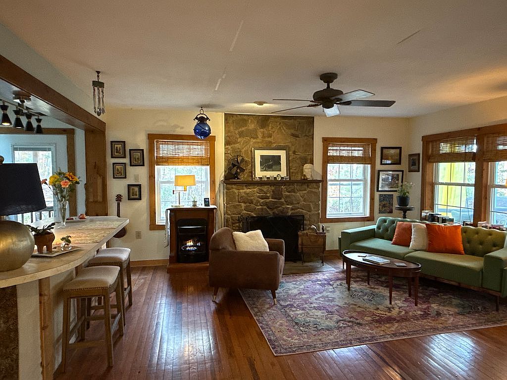 This cozy living room features a mix of vintage charm and modern comfort. The focal point is a rustic stone fireplace, framed by wooden mantel and artwork. Soft brown hardwood floors create warmth, complemented by an intricate area rug in rich colors. A light green sofa adorned with orange and white throw pillows provides a pop of color. Adjacent, a wooden kitchenette bar with stools offers casual seating. Natural light pours in through large windows dressed with bamboo shades, while the ceiling fan adds to the relaxed atmosphere. Decorative accents include framed photos and a vase of fresh flowers.