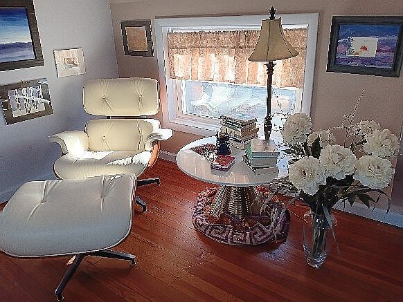 A cozy reading nook adorned with a contemporary aesthetic. The space features a sleek, white lounge chair paired with a matching ottoman, emphasizing comfort. A glass-topped round table stands at its center, accompanied by an arrangement of books and a bouquet of artificial flowers, adding a touch of elegance. Natural light streams through a large window with a softly textured, light-filtering shade, creating a warm ambiance. The walls are decorated with framed artwork, enhancing the artistic feel. Rich wooden flooring contrasts beautifully with the light furniture, bringing warmth and inviting charm to the environment.