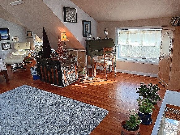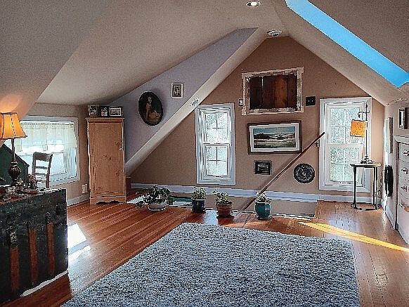 This cozy attic space features sloped ceilings with a modern skylight, allowing natural light to flood in. The walls are painted in soft, earthy tones, blending beige and lavender, creating a peaceful ambiance. A plush area rug anchors the room’s center, complemented by hardwood flooring that adds warmth. Various art pieces and photographs adorn the walls, enhancing the artistic vibe. Windows provide lovely views and allow for fresh air. A small wooden cabinet and a chair add functional seating and storage, while potted plants bring a touch of nature indoors. Overall, this space feels inviting and artistic.