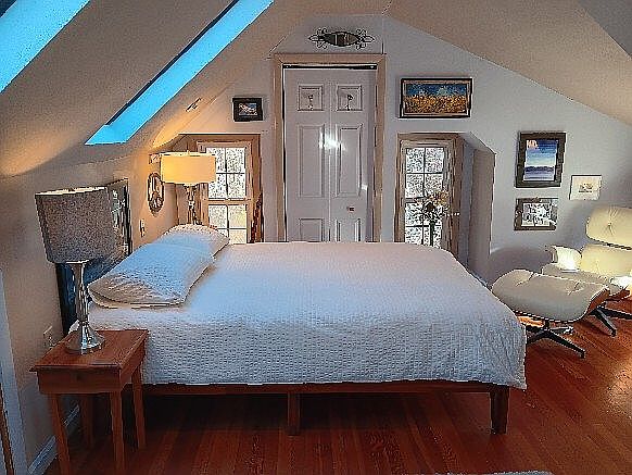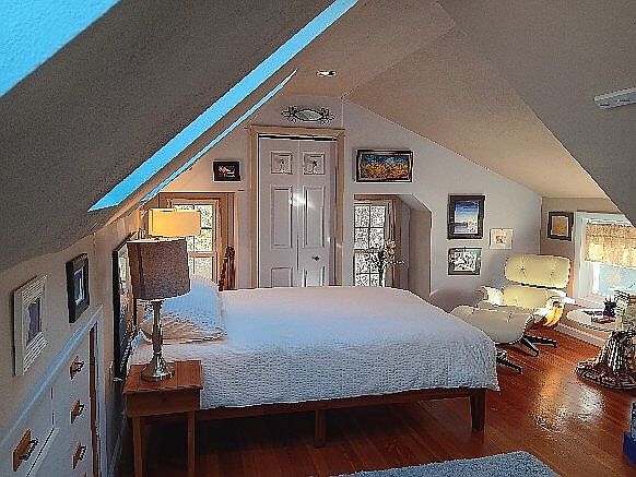This cozy attic bedroom features a sloped ceiling with blue skylights, allowing natural light to flood the space. A large, white bed takes center stage, complemented by a simple wooden nightstand and a stylish lamp that adds warmth. The walls are a soft gray, adorned with personal artwork and framed photos, enhancing the room’s character. Opposite the bed, a modern armchair invites relaxation, with a warm wood finish echoing the hardwood floor. The double doors lead to additional storage or closet space, creating a seamless flow between functionality and comfort in this intimate retreat.