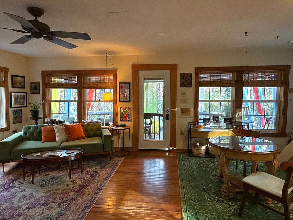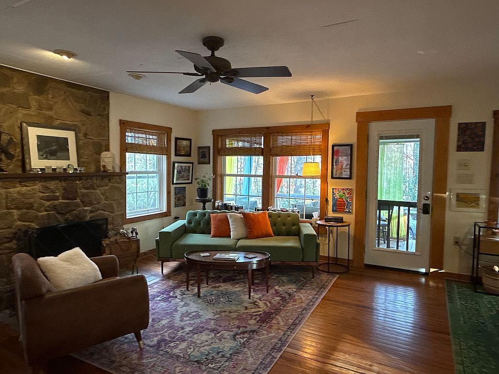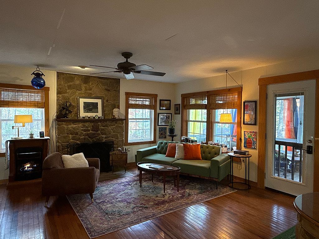 This cozy living room features a blend of comfort and rustic charm. A prominent stone fireplace anchors the space, complemented by warm wooden accents in the window frames and door. A tufted green sofa, adorned with orange and white throw pillows, invites relaxation along with a brown leather chair. A round table rests centrally on an intricately patterned area rug, which enhances the warmth of the hardwood floor. Natural light spills through large windows, accented by bamboo shades, illuminating colorful artwork on the walls and adding vibrancy to the inviting atmosphere.