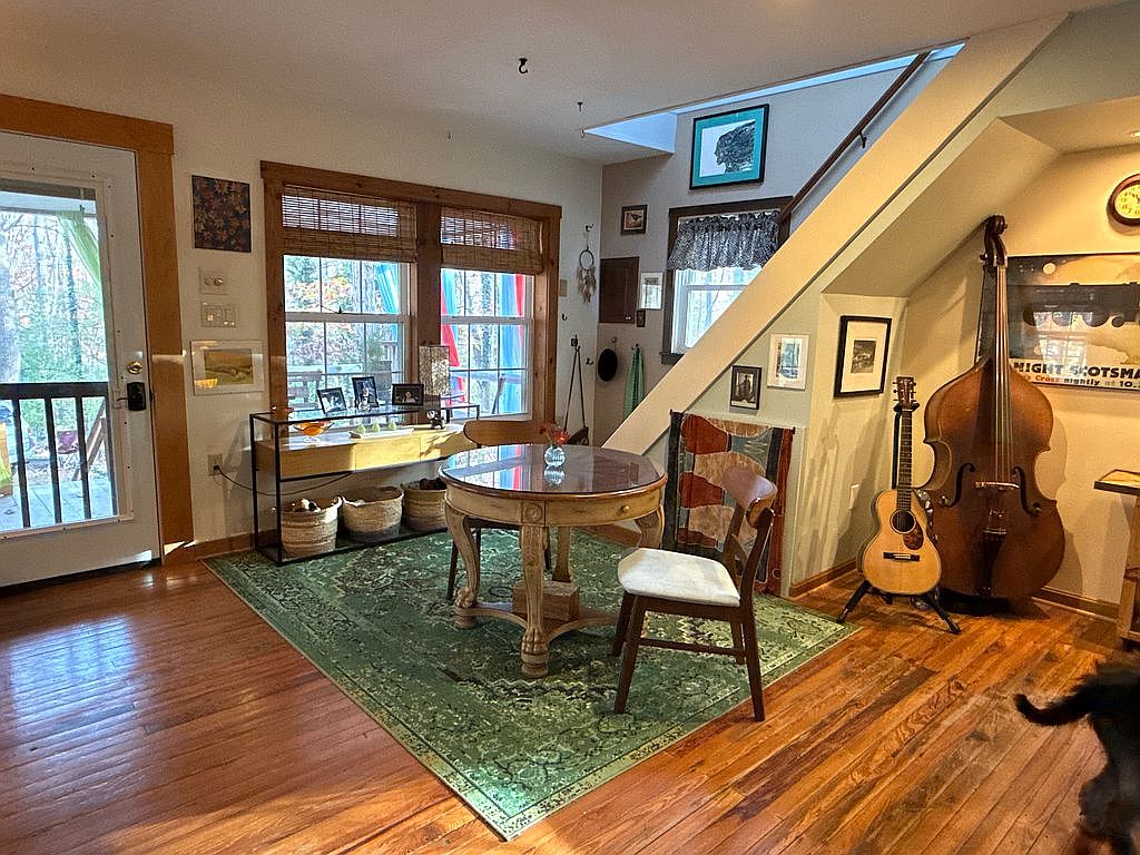 This cozy dining area features a round wooden table surrounded by a mixed set of chairs, offering an inviting atmosphere. The warm hardwood floor complements the intricate green and gold patterned rug beneath the table. Natural light streams through the large windows adorned with bamboo shades, revealing a serene outdoor view. A glass display table holds framed photographs and decorative artifacts, adding personal touches. The wall displays an eclectic mix of artwork, enhancing the character of the space. To one side, musical instruments, including a guitar and bass, suggest a creative ambiance, reflecting a harmonious blend of function and style.