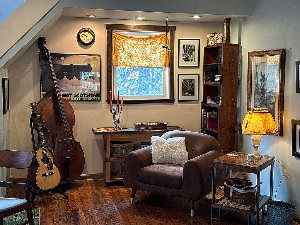 This intimate corner features a blend of rustic and vintage elements. The wooden flooring warms the space, complemented by a rich brown, rounded couch adorned with a fluffy white throw pillow. Beside it, a small side table holds an antique lamp emitting a soft glow. A sturdy, artful shelf displays framed photographs and decorative items, adding a personal touch. Opposite, a tall double bass and an acoustic guitar create a musical ambiance. The window, dressed in a cheerful orange fabric, allows natural light to filter in, enhancing the cozy atmosphere of this inviting retreat.