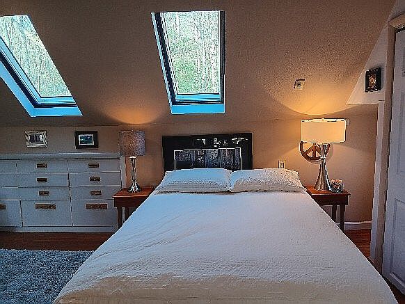 This cozy bedroom features a sloped ceiling with two skylights that bring in natural light, highlighting the soft, neutral color palette of the walls. A comfortable white bed with simple bedding anchors the space, flanked by two elegant wooden side tables. One table holds a stylish lamp, while the other showcases a unique circular lamp. Behind the bed, a dark headboard contrasts beautifully with the light surroundings. A white dresser with sleek gold handles adds storage, enhancing the room’s functionality. The plush blue rug underfoot complements the warm wooden floors, creating an inviting atmosphere.