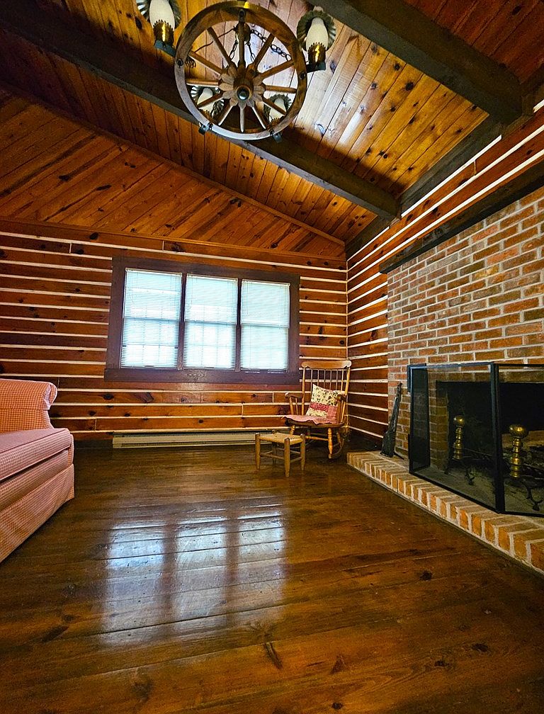 A cozy living room space featuring rich wooden accents and a rustic charm. The walls are clad in horizontal wooden planks, contributing to a warm, inviting atmosphere. A brick fireplace, partially enclosed with a metal screen, stands against one wall, complementing the natural wood elements. Light pours in through a large window adorned with blinds, while a vintage chandelier, resembling a wagon wheel, hangs from the ceiling, enhancing the room’s rustic aesthetic. The sturdy wooden floor showcases a polished, reflective finish, with a pink-checkered couch and a rocking chair inviting relaxation.