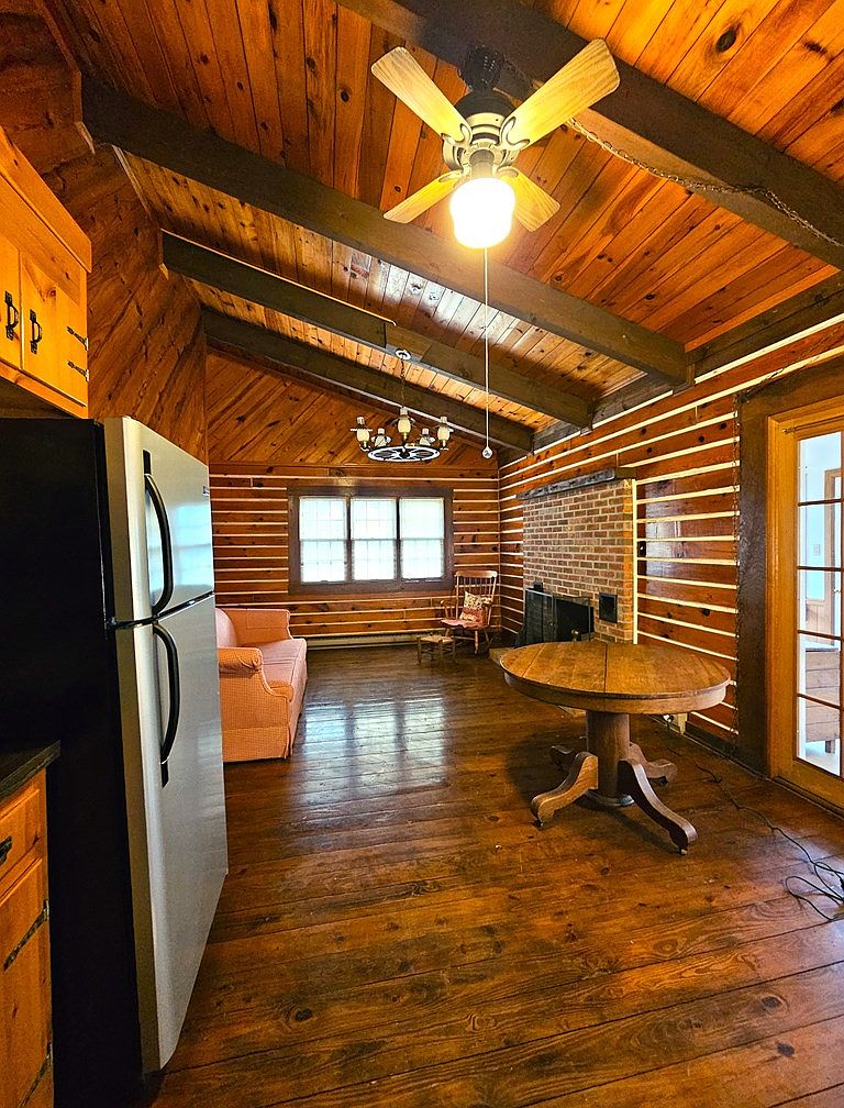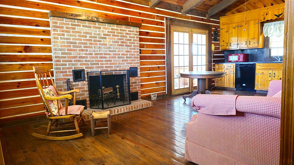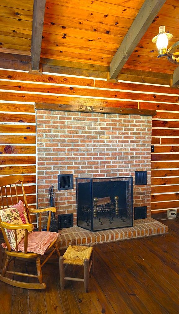 A cozy living room features a striking brick fireplace as its centerpiece, exuding warmth and rustic charm. The fireplace is framed by a polished wooden mantel, accentuating the brick’s rich earthy tones. Wooden beams stretch across the ceiling, enhancing the room’s verticality and bringing a natural feel. The walls exhibit a mix of log cabin-style slats and smooth wood, creating visual interest. A vintage rocking chair, adorned with a floral cushion, invites relaxation. The rich, dark hardwood floor complements the warm hues of the wood and brick, making the space inviting and homely.