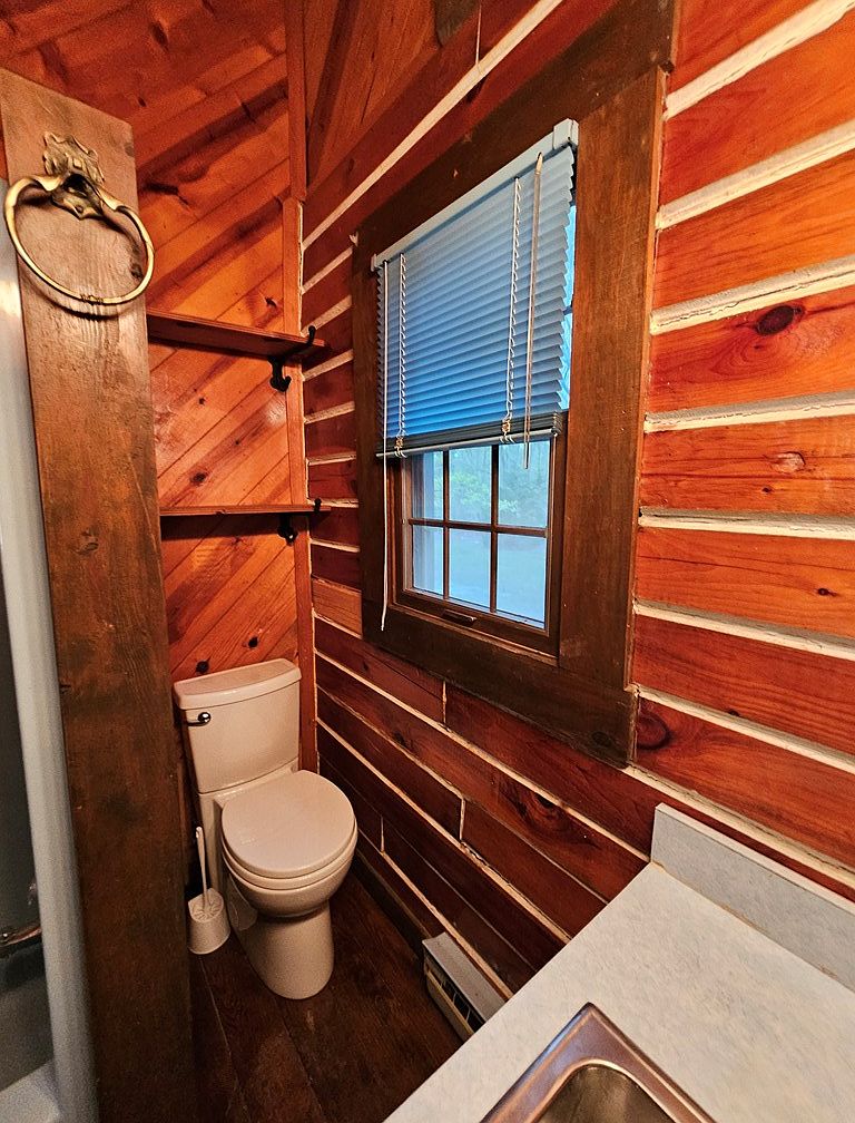 This bathroom showcases rustic charm with its warm wooden tones from the log walls, creating an inviting atmosphere. The vertical and diagonal wood paneling adds texture and a touch of traditional craftsmanship. A small window, adorned with blinds, allows natural light to filter in, enhancing the cozy feel. The white toilet maintains a clean contrast against the rich wood while the dark wooden shelving serves a functional purpose and complements the overall aesthetic. A simple countertop with a sink provides practicality, balancing rustic elements with modern convenience, creating a unique and functional space.