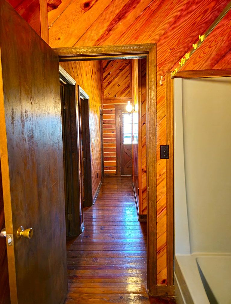 A warm wooden hallway features walls and ceiling finished in rich cedar planks, enhancing the rustic charm. The floor is polished hardwood with a glossy sheen, reflecting light from a vintage pendant light fixture. Doorways lead to other rooms, framed in dark wood, adding to the cozy atmosphere. Natural light enters through a small window at the end of the hall, illuminating the space. Elements of craftsmanship are highlighted in the angled ceilings and the uniformity of the wood grain, creating a cohesive and inviting look throughout. The overall aesthetic combines a traditional and homely feel, perfect for a historic home.