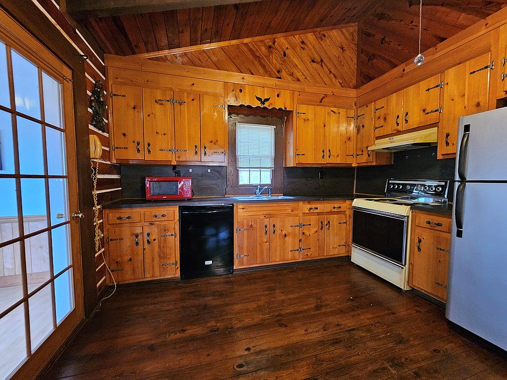 This kitchen features a cozy, rustic charm with warm wooden cabinetry that runs along the walls, offering ample storage. The cabinets are complemented by antique-style pulls, enhancing the vintage look. A sleek black refrigerator and microwave contrast against the surrounding wood, while a classic white stove adds a traditional touch. The dark countertops provide a stylish balance to the lighter wood tones in the cabinetry. Natural light filters through a small window above the sink, creating an inviting atmosphere. The room retains warmth due to the wooden ceiling beams and floor, enhancing the overall rustic ambiance.