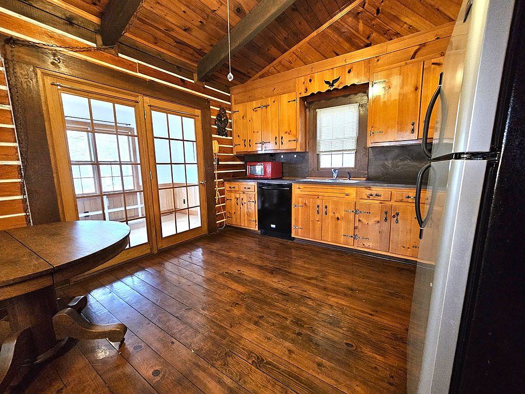 This kitchen features rustic charm with warm wooden tones, showcasing natural wood cabinetry and floors. The walls are adorned with log accents, enhancing the cabin-like atmosphere. A round wooden dining table is positioned to the left, inviting casual meals. Appliances include a black fridge and a red microwave, creating a modern contrast against the warm wood. Natural light filters in through large glass sliding doors, leading to another room, which adds depth and openness to the space. The ceiling boasts exposed beams, contributing to the cozy, homey feel of this inviting kitchen.